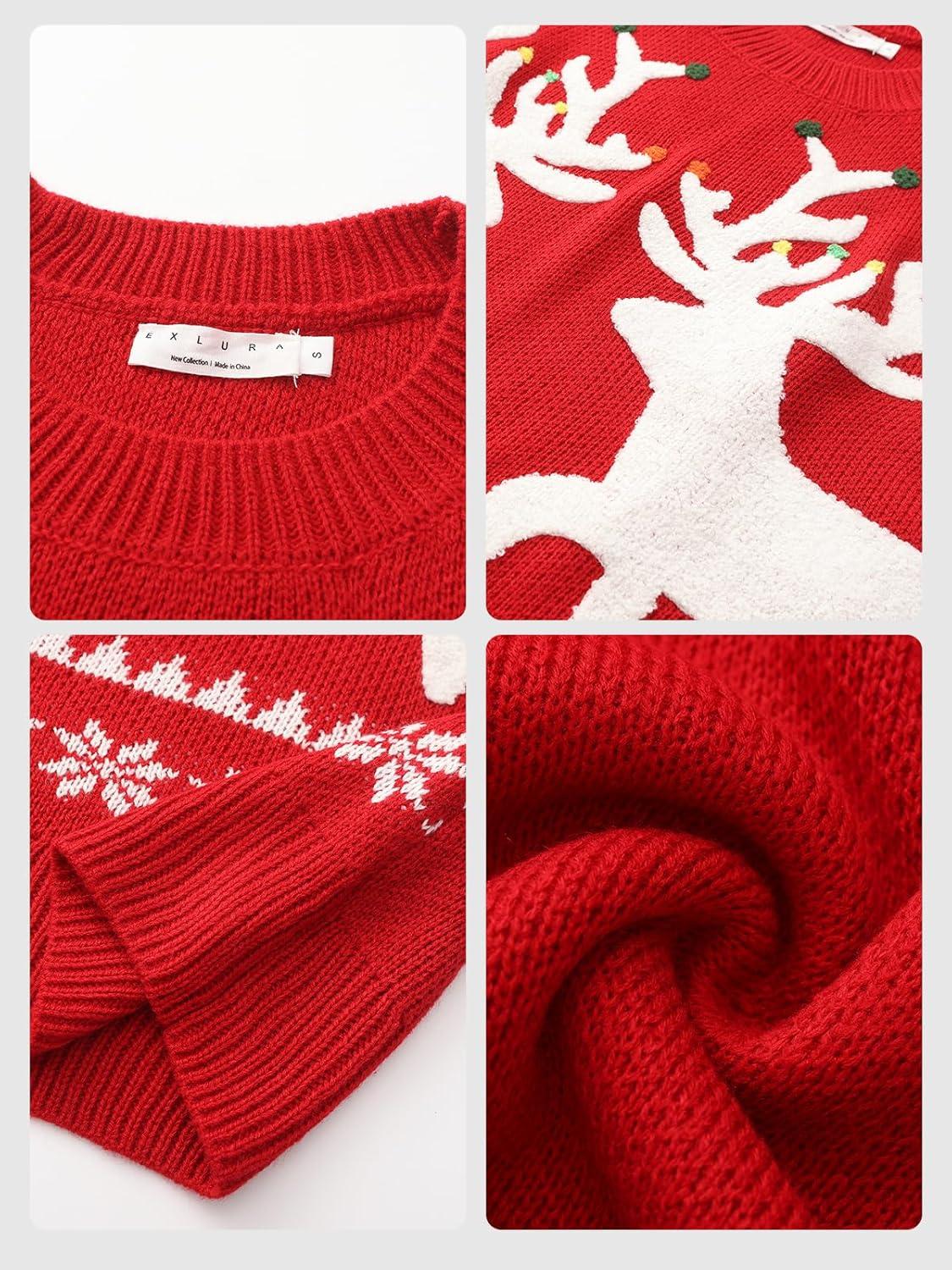EXLURA Patterns Reindeer Ugly Christmas Crew Neck Long Sleeve Sweater Jumper Pullover Knitted Printed Tops(Elk Red)