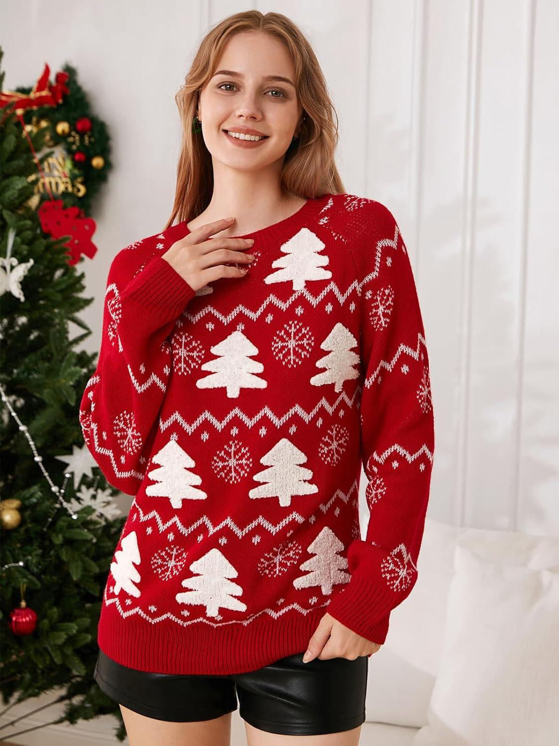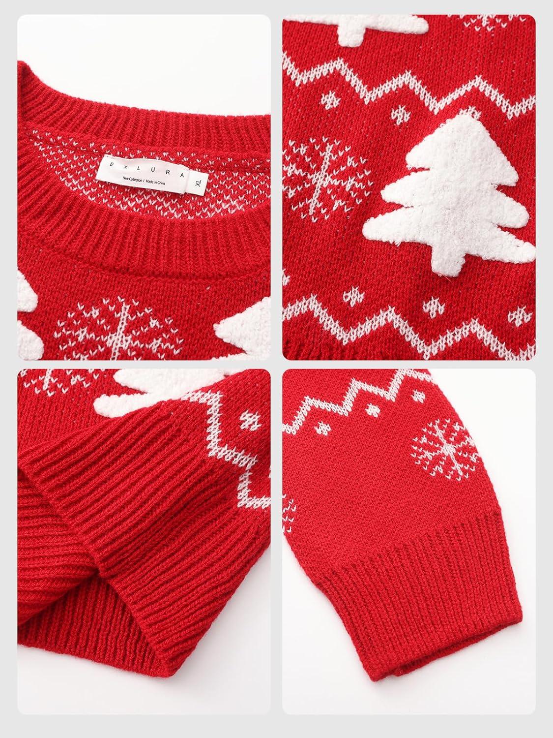EXLURA Patterns Reindeer Ugly Christmas Crew Neck Long Sleeve Sweater Jumper Pullover Knitted Printed Tops(Tree Red)