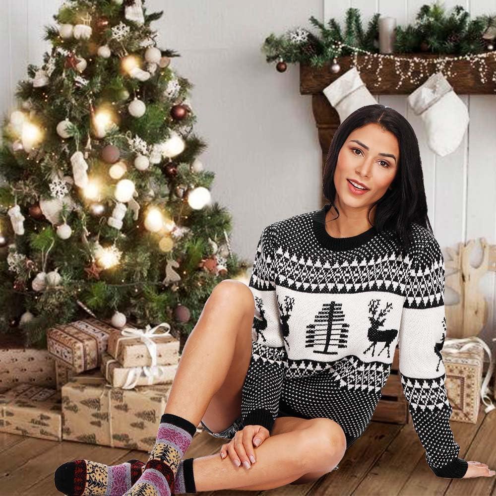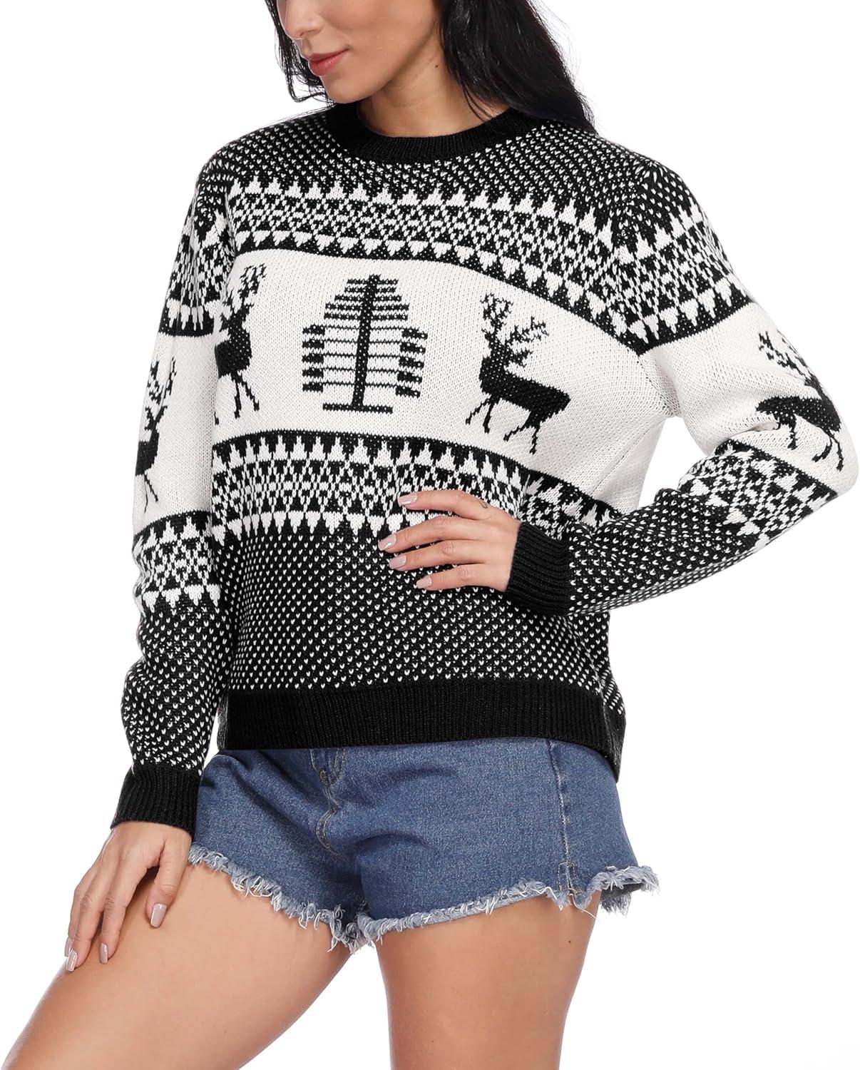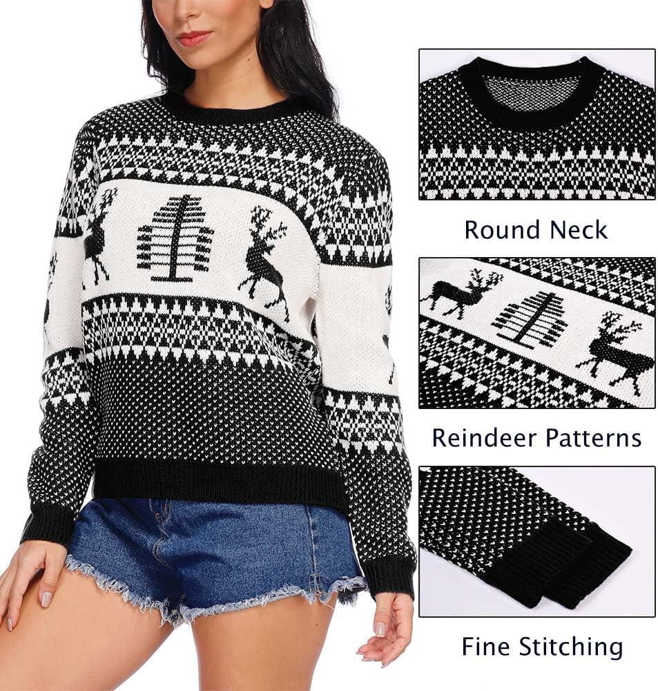 EXLURA Patterns Reindeer Ugly Christmas Crew Neck Long Sleeve Sweater Jumper Pullover Knitted Printed Tops(White Black Reindeer)