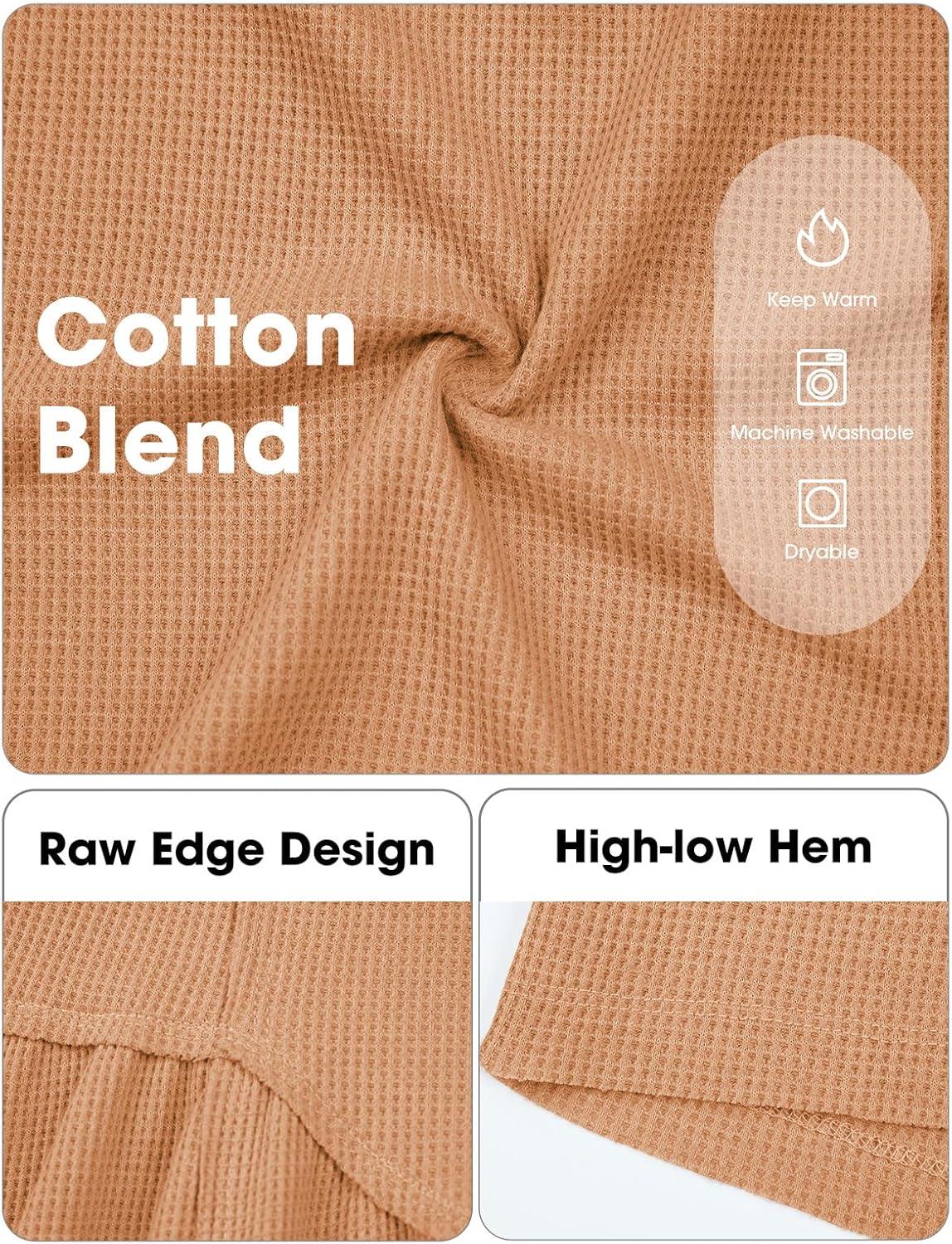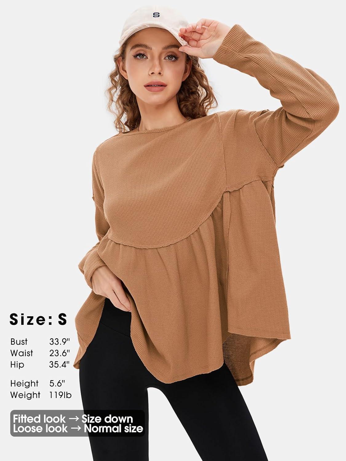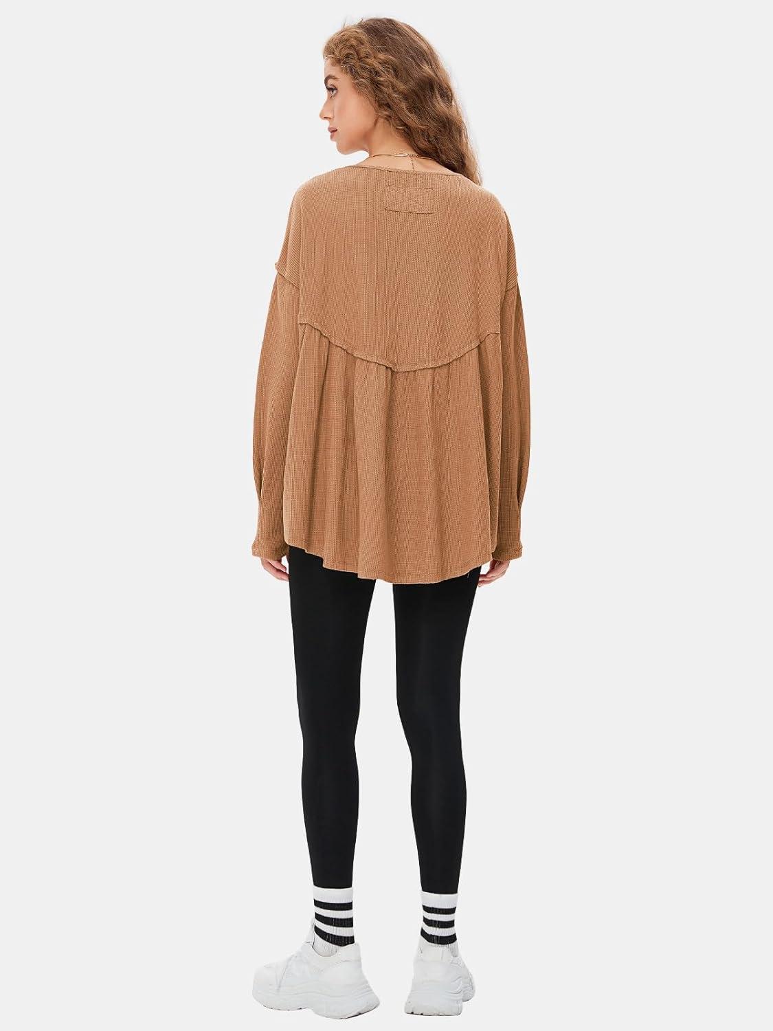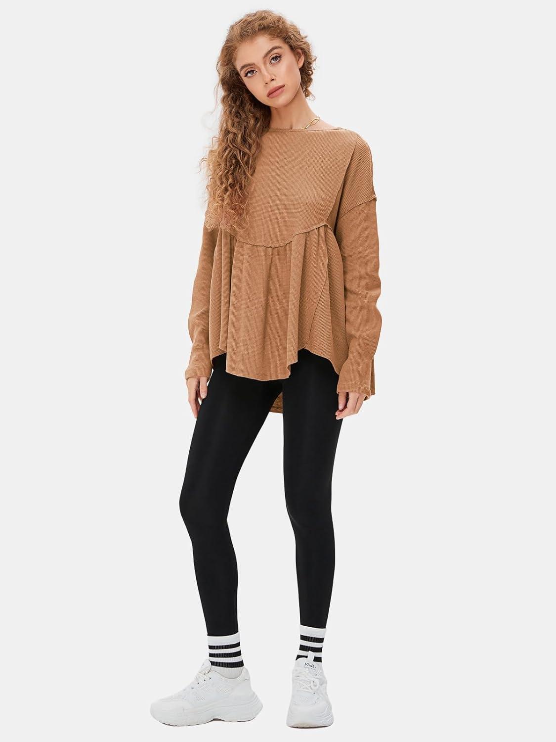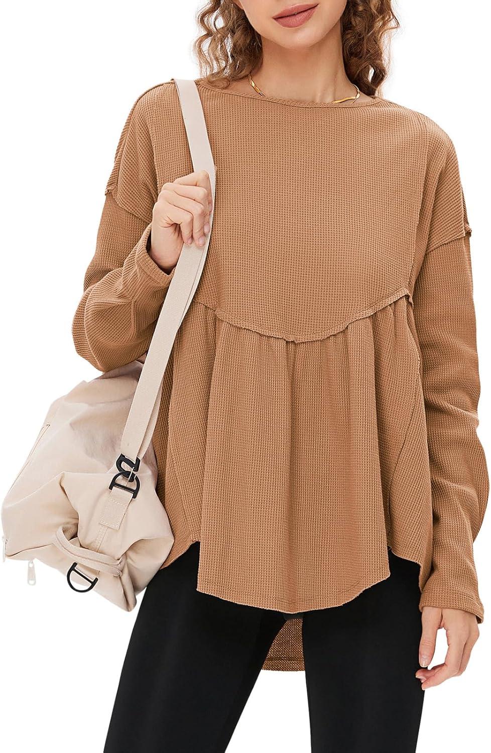 EXLURA Waffle Knit Long Sleeve Shirts for Womens Crewneck Loose Babydoll Tunic Tops Maternity Tops Fall Fashion 2025 Clothes(Khaki)
