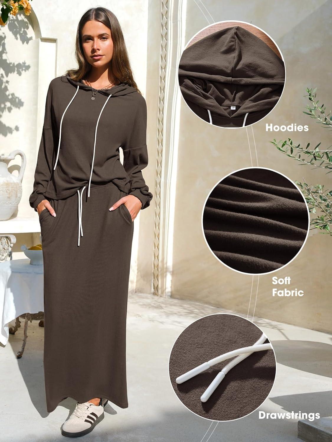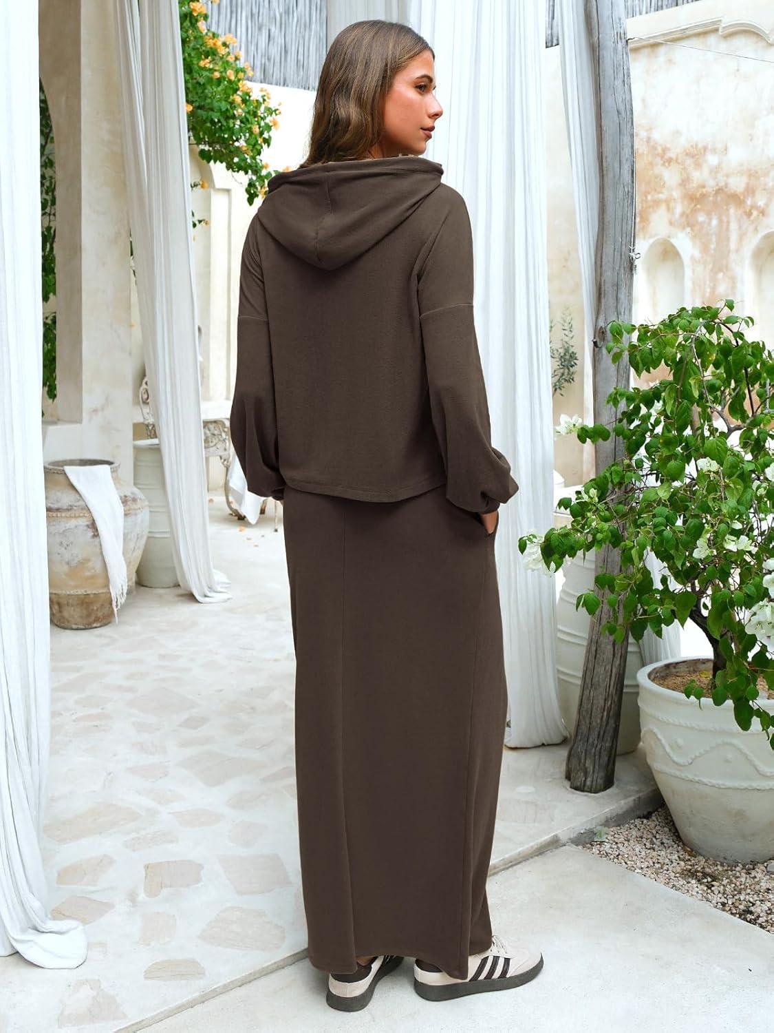 EXLURA Women 2 Piece Outfits Fall Airport Long Sleeve Hoodies Matching Long Skirt Dress Sweatsuits Lounge Sets Winter 2025(Coffee)