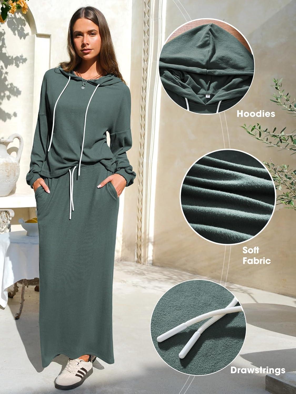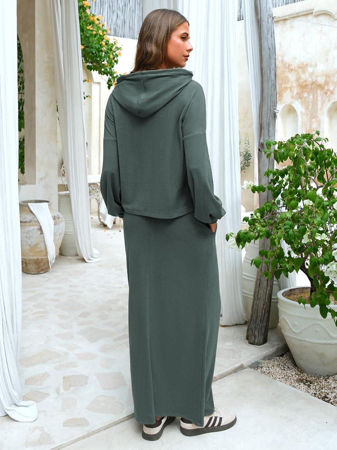 EXLURA Women 2 Piece Outfits Fall Airport Long Sleeve Hoodies Matching Long Skirt Dress Sweatsuits Lounge Sets Winter 2025(Grey Green)
