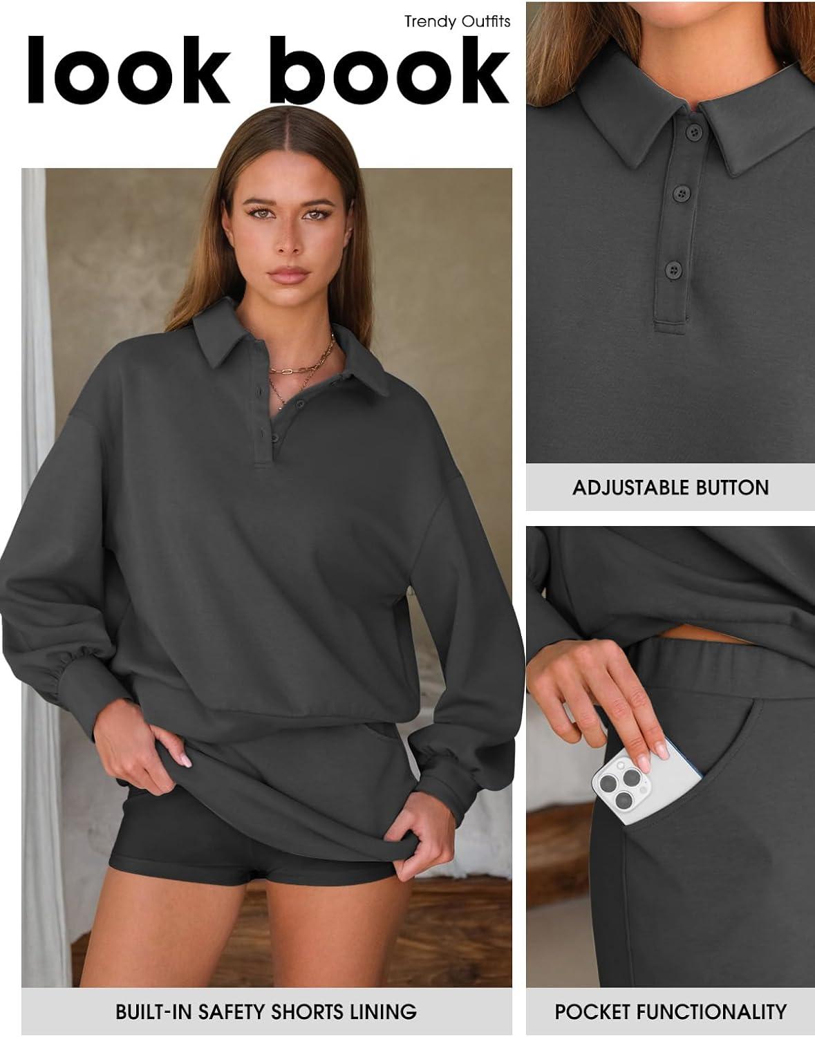 EXLURA Women 2 Piece Outfits Fall Airport Polo Sweatshirt Skirt Set Skort Workout Sweatsuits Matching Lounge Sets Winter 2025(Dark Grey)
