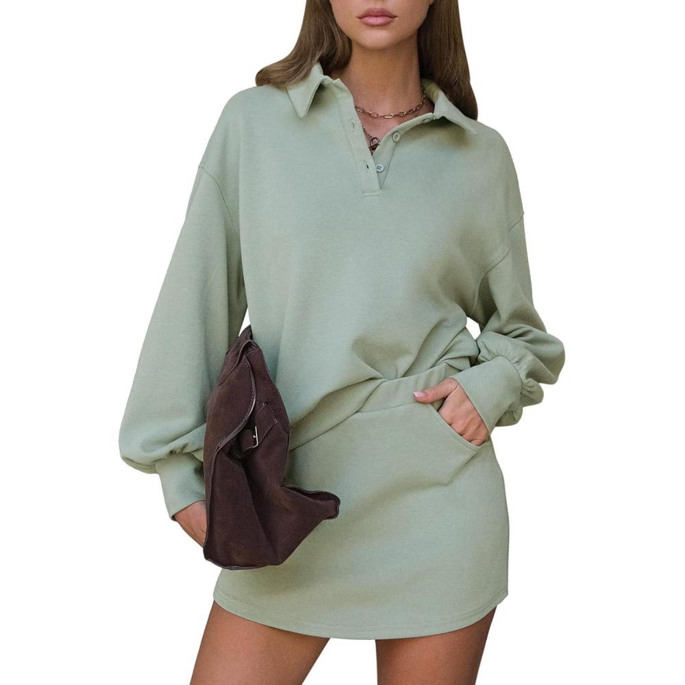 EXLURA Women 2 Piece Outfits Fall Airport Polo Sweatshirt Skirt Set Skort Workout Sweatsuits Matching Lounge Sets Winter 2025(Grey Green)