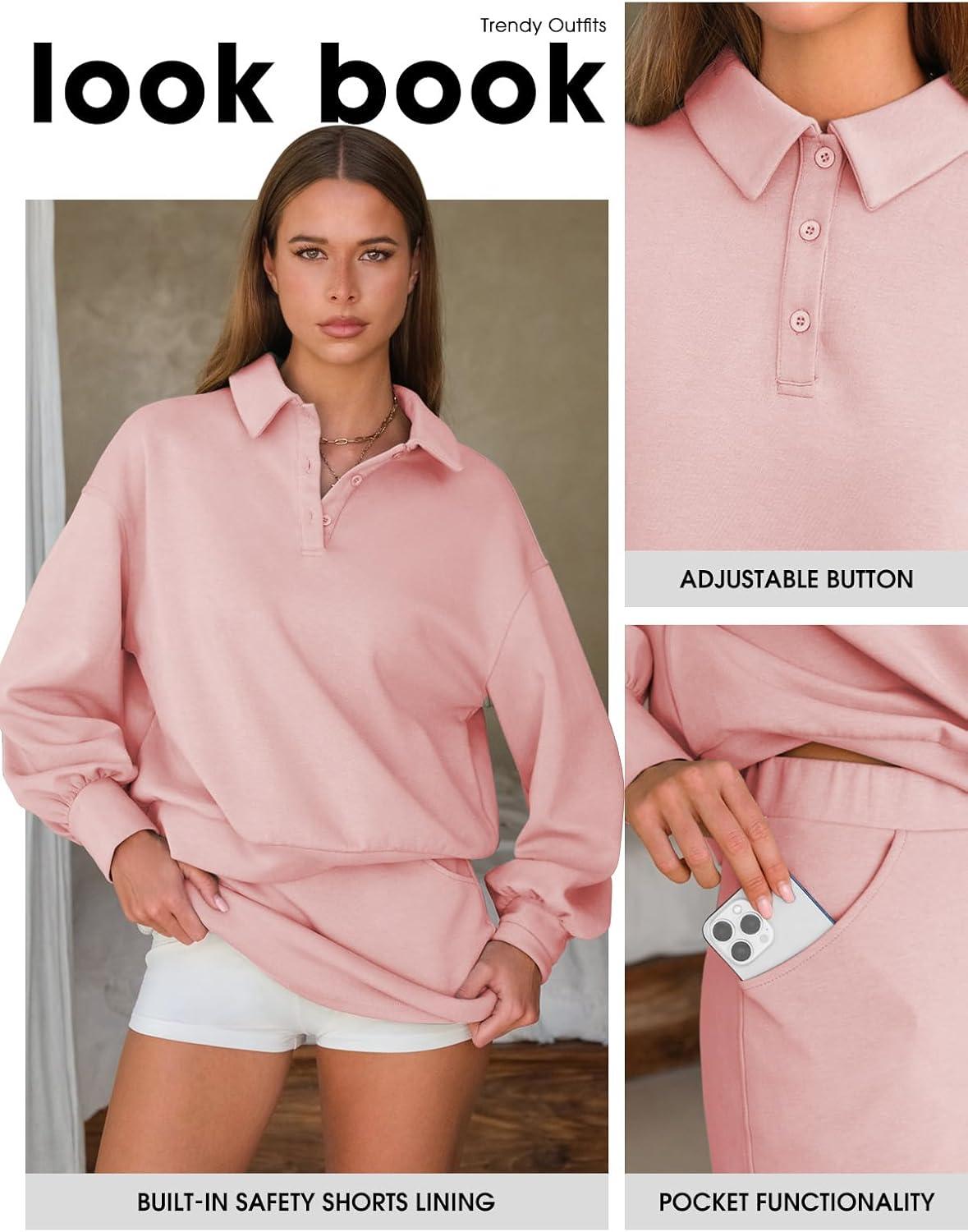 EXLURA Women 2 Piece Outfits Fall Airport Polo Sweatshirt Skirt Set Skort Workout Sweatsuits Matching Lounge Sets Winter 2025(Pink)