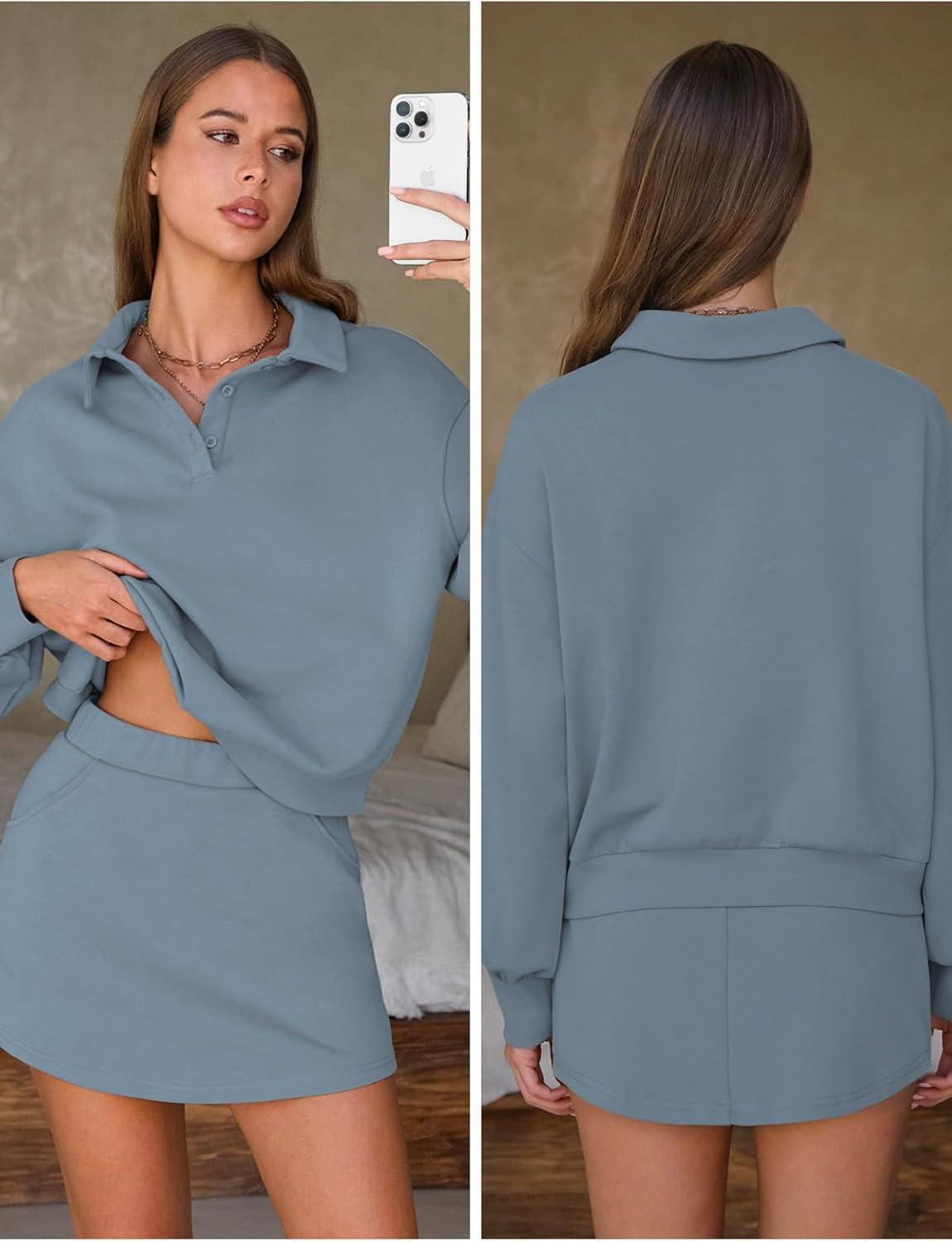 EXLURA Women 2 Piece Outfits Fall Airport Polo Sweatshirt Skirt Set Skort Workout Sweatsuits Matching Travel Lounge Sets 2025(Grey Blue)