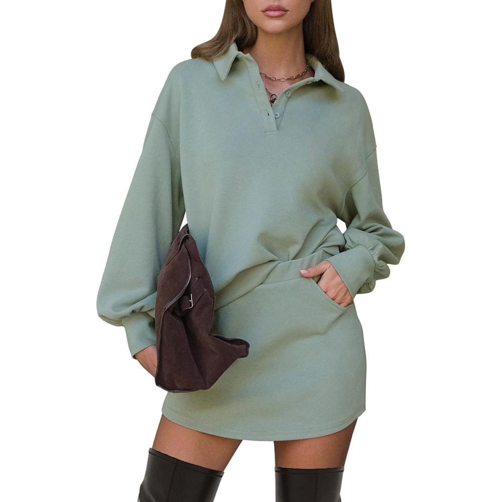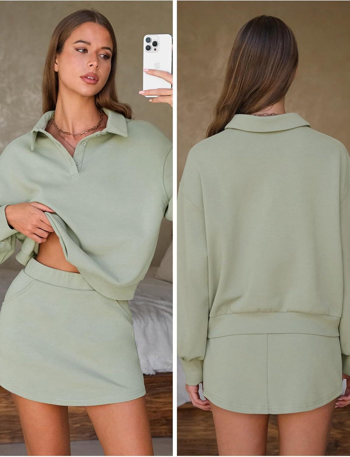 EXLURA Women 2 Piece Outfits Fall Airport Polo Sweatshirt Skirt Set Skort Workout Sweatsuits Matching Travel Lounge Sets 2025(Grey Green)