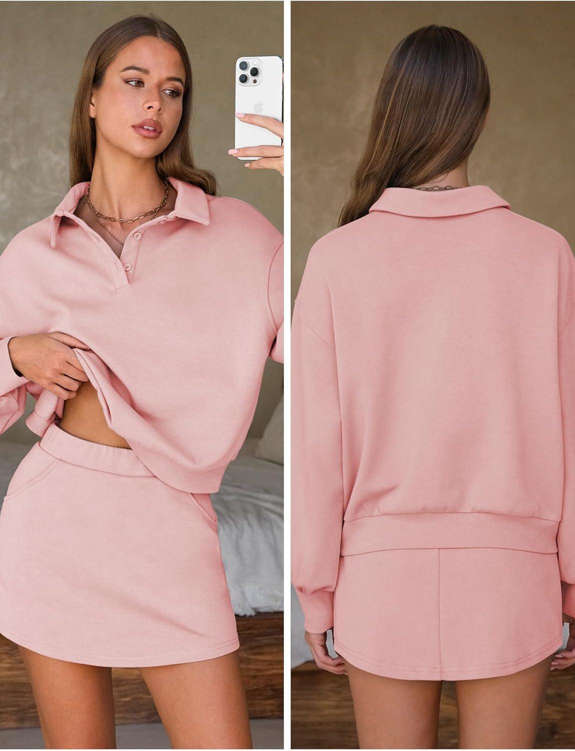 EXLURA Women 2 Piece Outfits Fall Airport Polo Sweatshirt Skirt Set Skort Workout Sweatsuits Matching Travel Lounge Sets 2025(Pink)