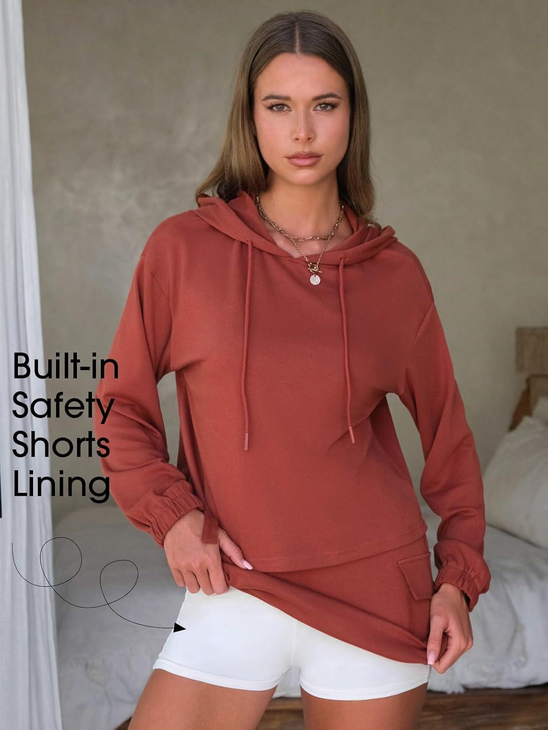 EXLURA Women 2 Piece Sets Cotton Sweatsuits Fall Hooded Sweatshirt Cargo Skort Skirt Stretchy Tracksuit Casual Tennis Pockets(Caramel)