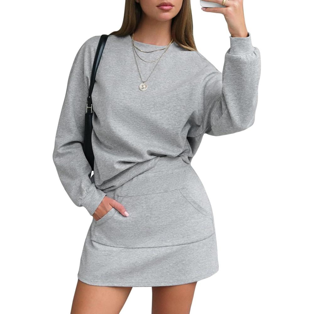 EXLURA Women 2 Piece Skirt Set Airport Outfits 2026 Cotton Travel Sweat Suit Casual Lounge Crewneck Sweatshirt Skort Sets(Grey)