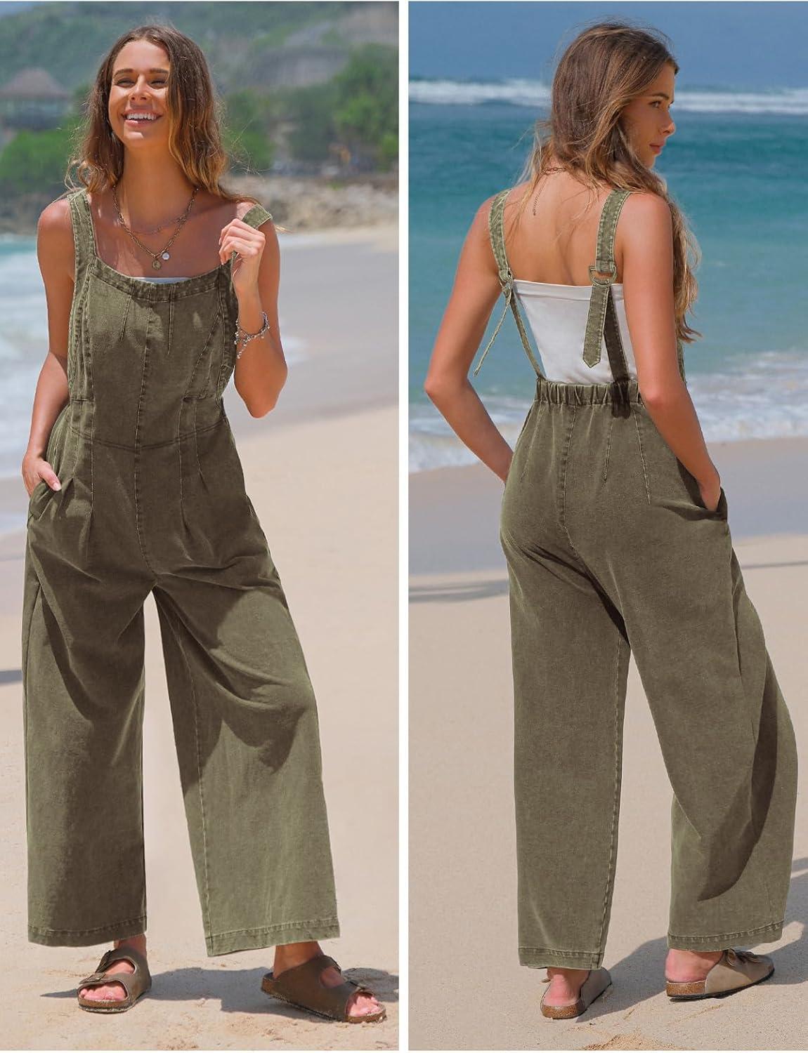 EXLURA Women Fall Overalls Denim Loose Fit Wide Leg Bib Jumpsuits Casual Adjustable Baggy Jeans Romper with Pockets 2025(Army Green)