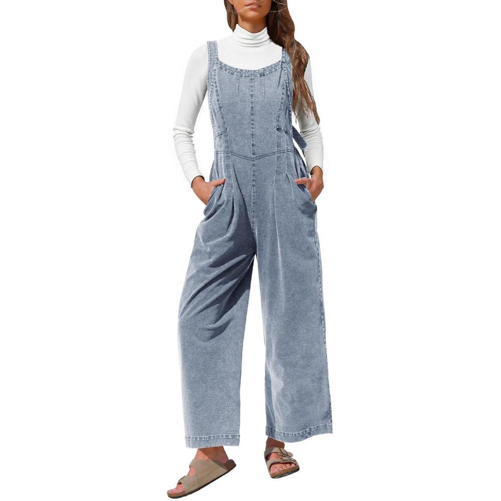 EXLURA Women Fall Overalls Denim Loose Fit Wide Leg Bib Jumpsuits Casual Adjustable Baggy Jeans Romper with Pockets 2025(Light Blue)