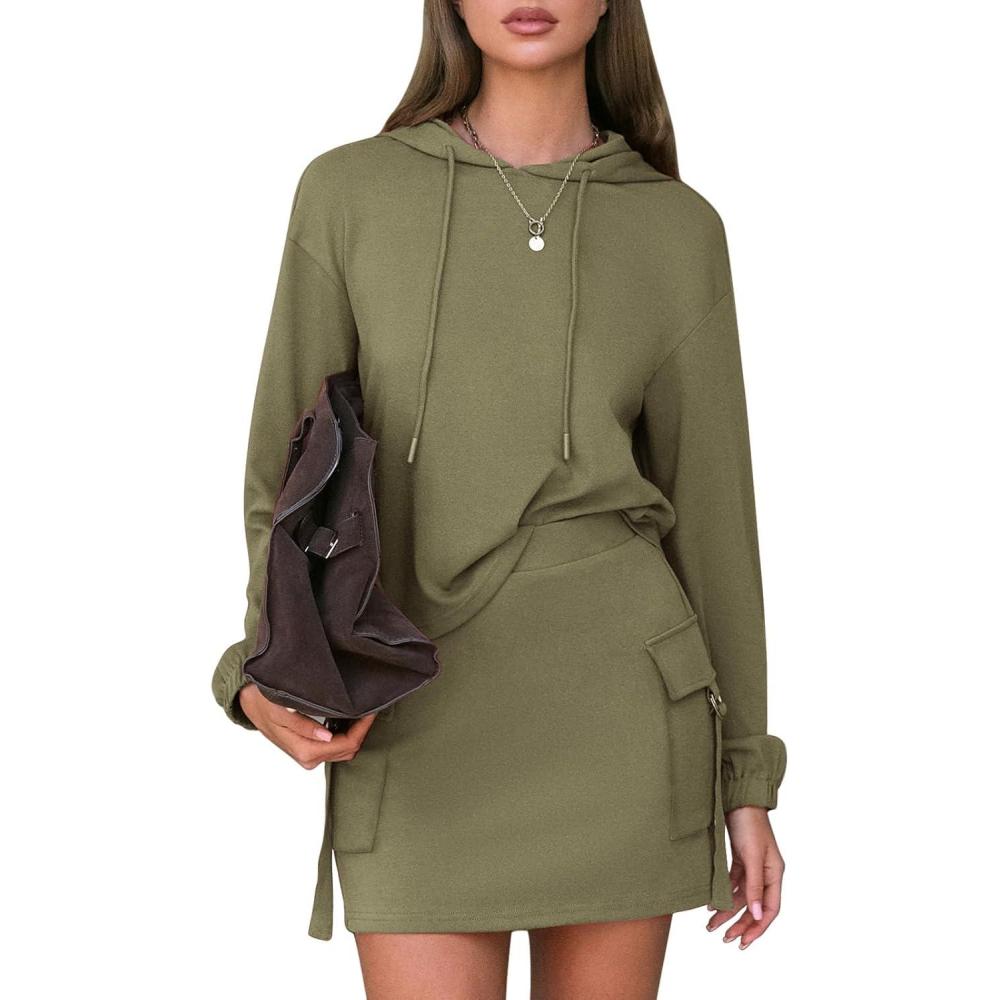 EXLURA Women Two Piece Set Cotton Sweatsuit Travel Airport Outfits 2026 Tracksuit Hooded Sweatshirt Cargo Skort Skirt Pockets(Army Green)