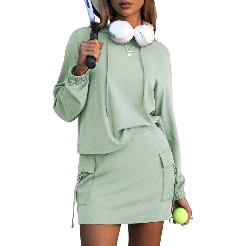EXLURA Women Two Piece Set Cotton Sweatsuit Travel Airport Outfits 2026 Tracksuit Hooded Sweatshirt Cargo Skort Skirt Pockets(Grey Green)