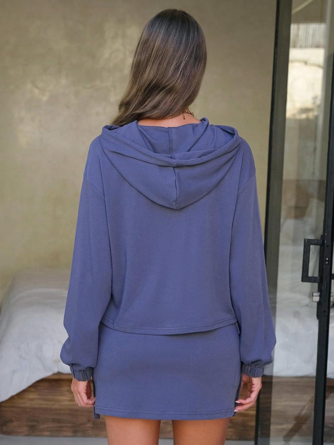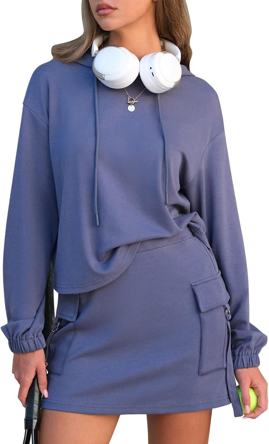 EXLURA Women Two Piece Set Cotton Sweatsuit Travel Airport Outfits Fall Tracksuit Hooded Sweatshirt Cargo Skort Skirt Pockets(Dark Blue)