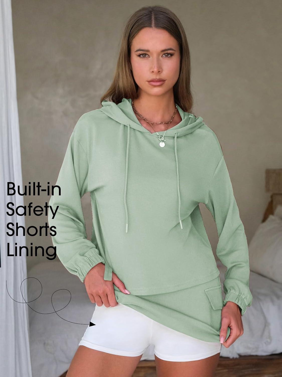 EXLURA Women Two Piece Set Cotton Sweatsuit Travel Airport Outfits Fall Tracksuit Hooded Sweatshirt Cargo Skort Skirt Pockets(Grey Green)