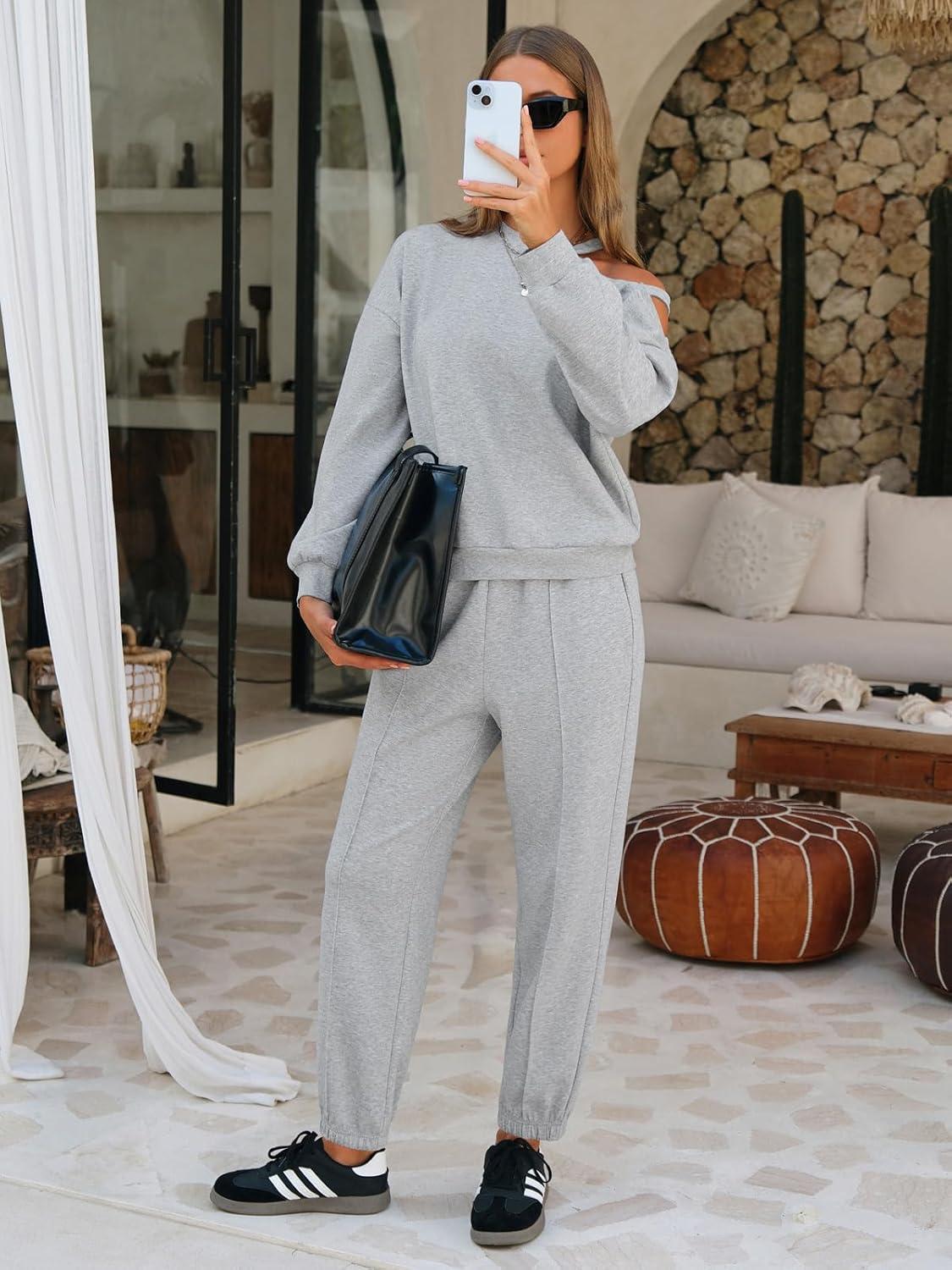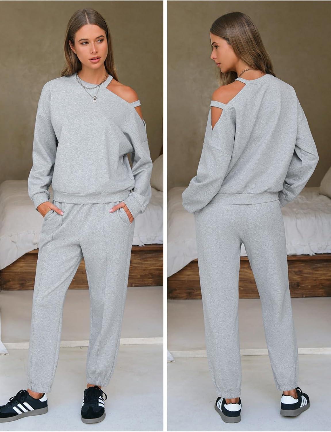 EXLURA Women’s 2 Piece Cold Shoulder Tracksuit Long Sleeve Cotton Jogger Pants Sweatsuit 2025(Grey)