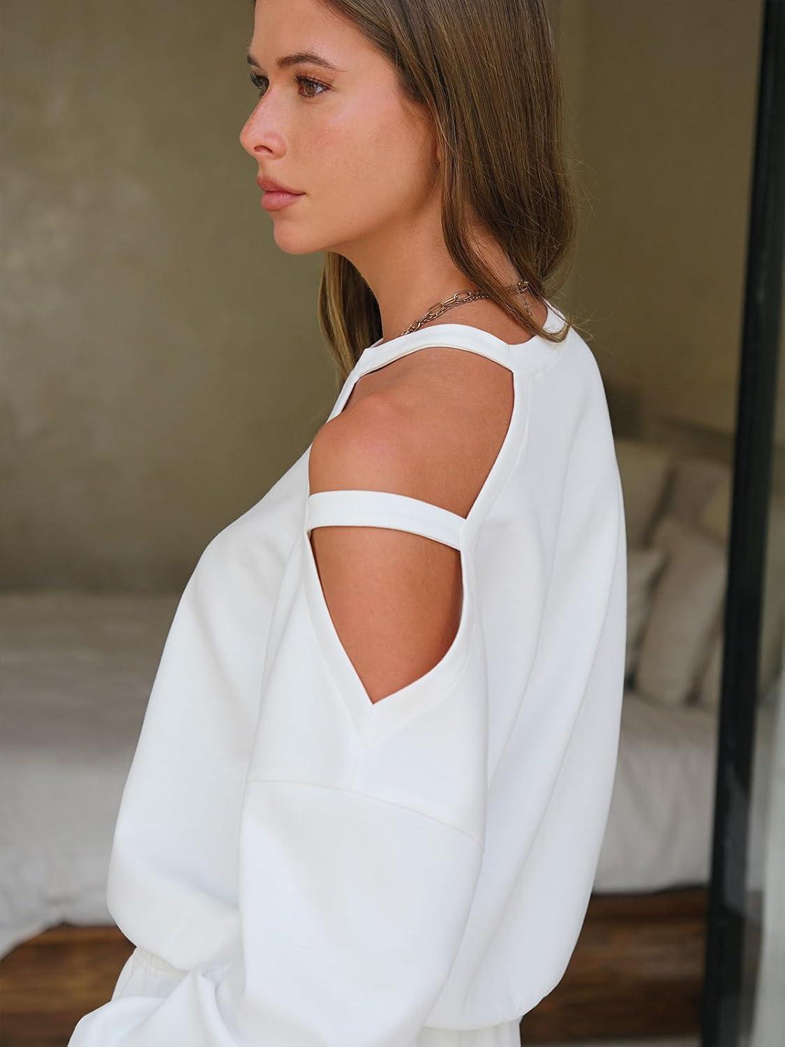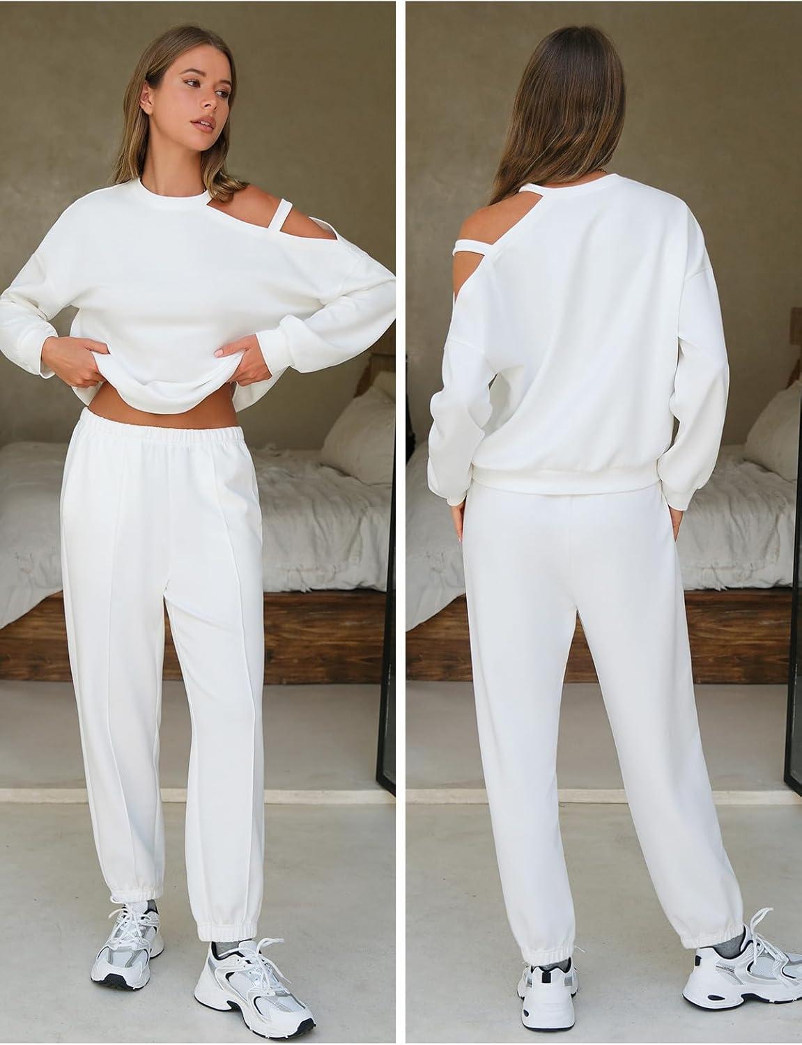 EXLURA Women’s 2 Piece Cold Shoulder Tracksuit Long Sleeve Cotton Jogger Pants Sweatsuit 2025(White)