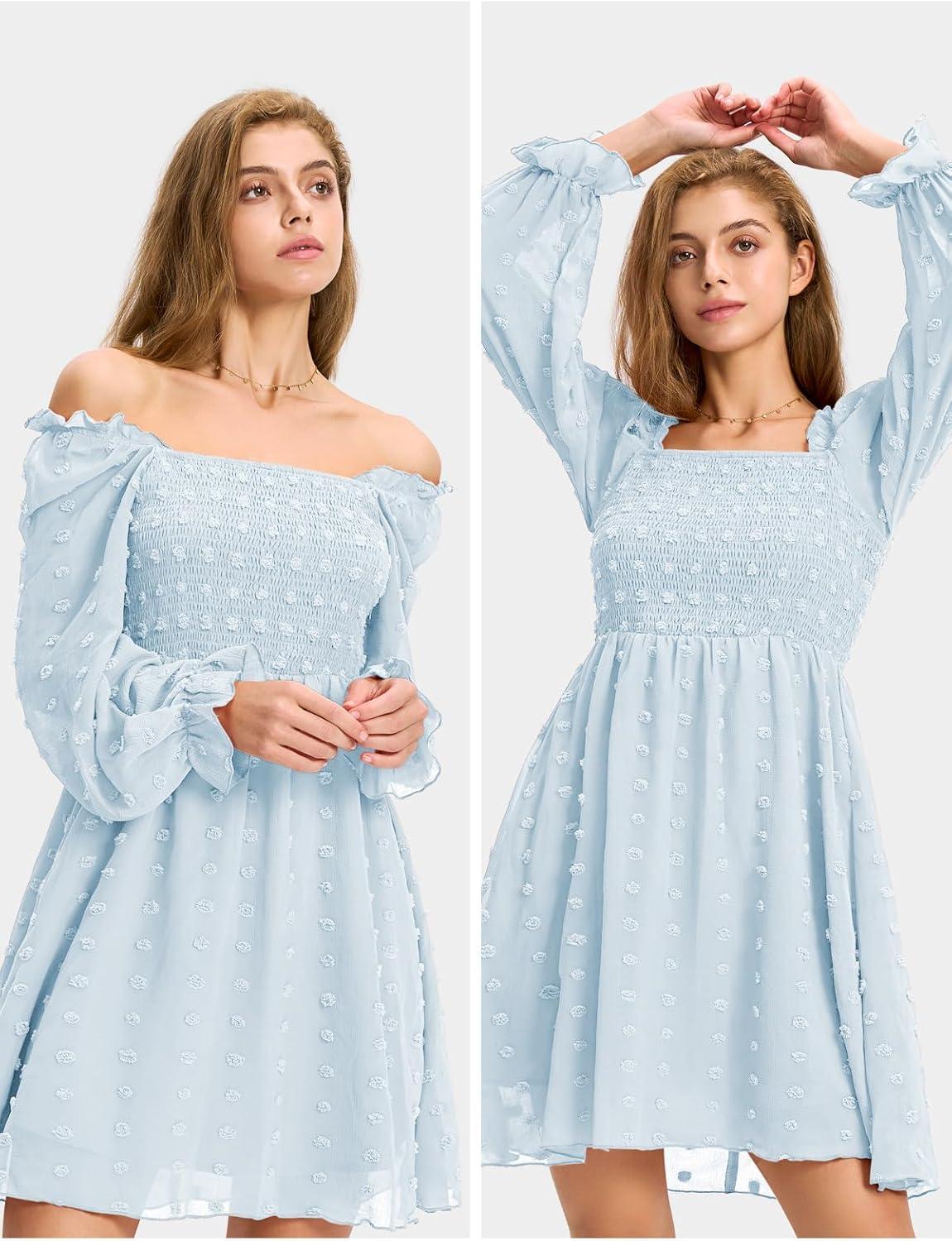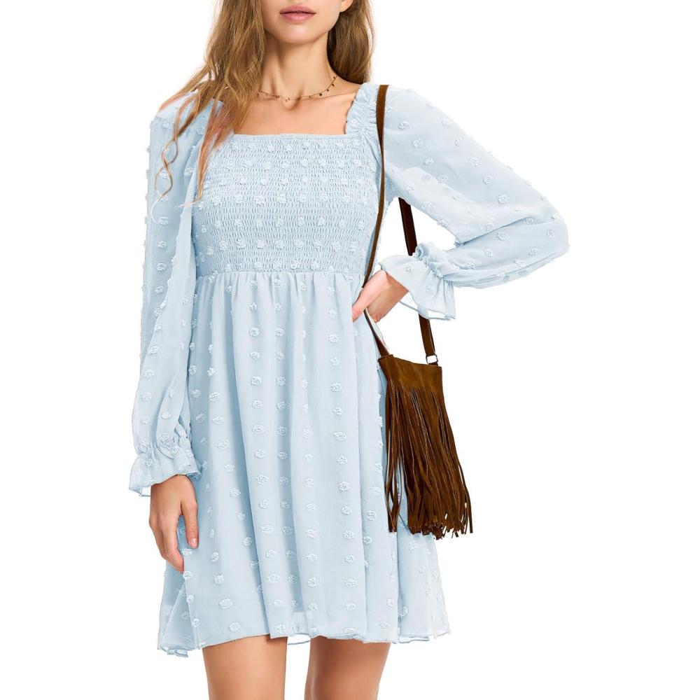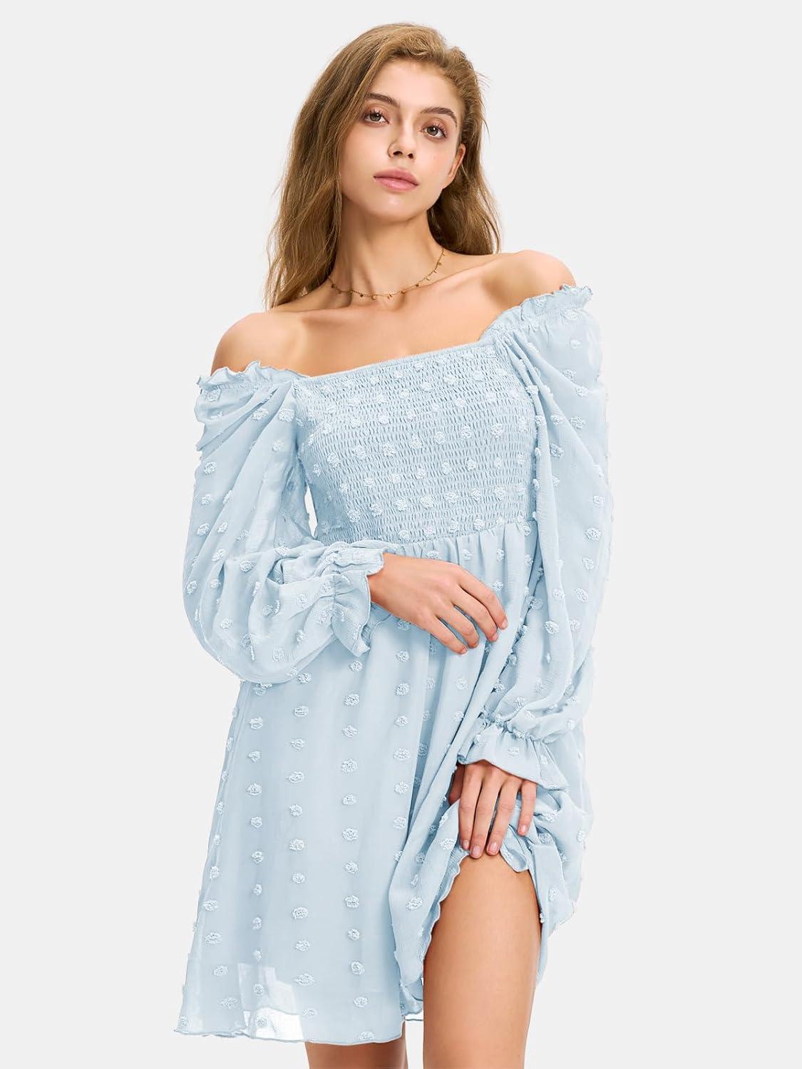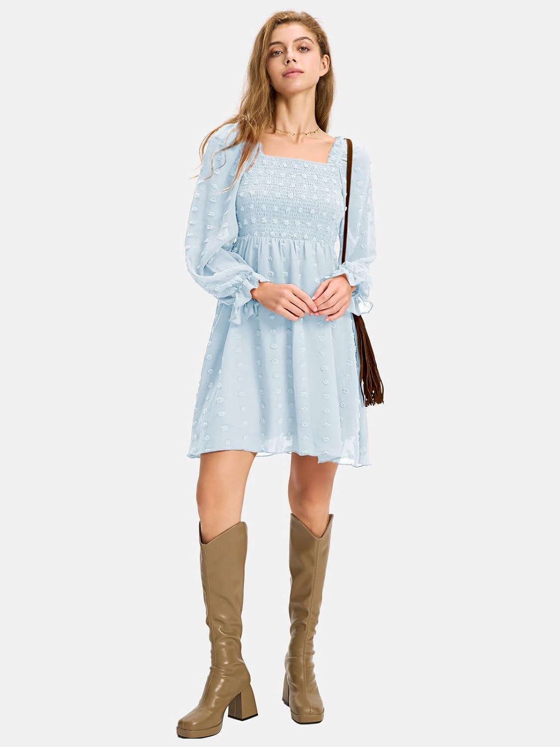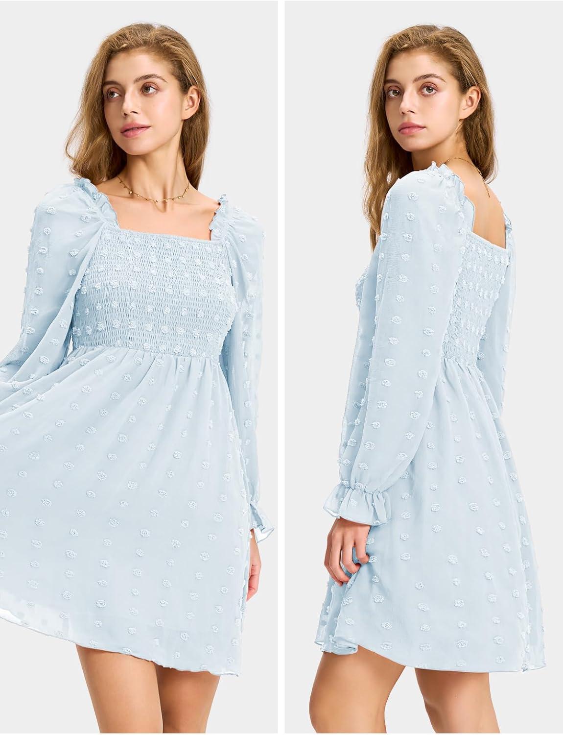 EXLURA Women’s 2025 Fall Long Sleeve Party Swiss Dot Dress Smocked Ruffle Cocktail Mini Dresses(Blue)