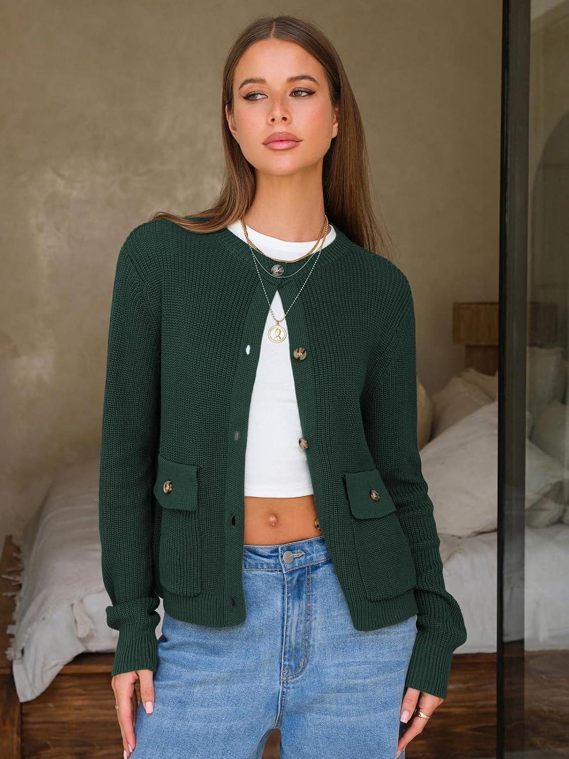 EXLURA Women’s 2025 Knit Cardigan Sweaters Early Fall Fashion Long Sleeve Open Front Button Down Trendy Casual Cropped Jacket(Dark Green)