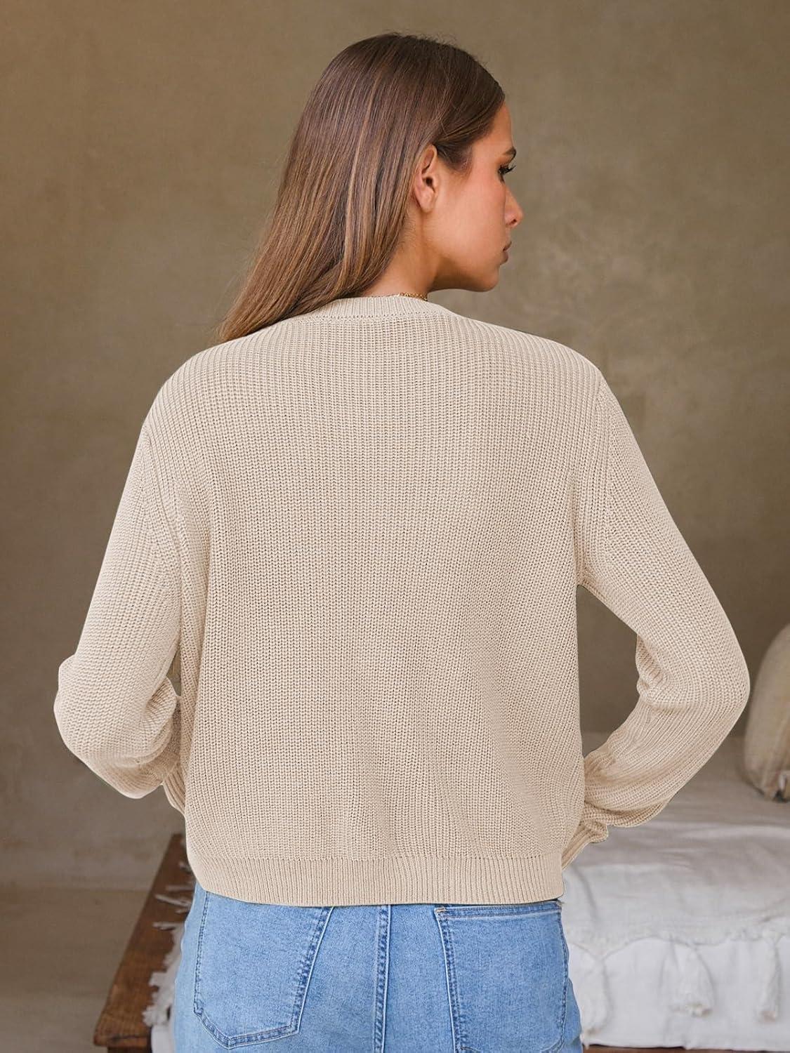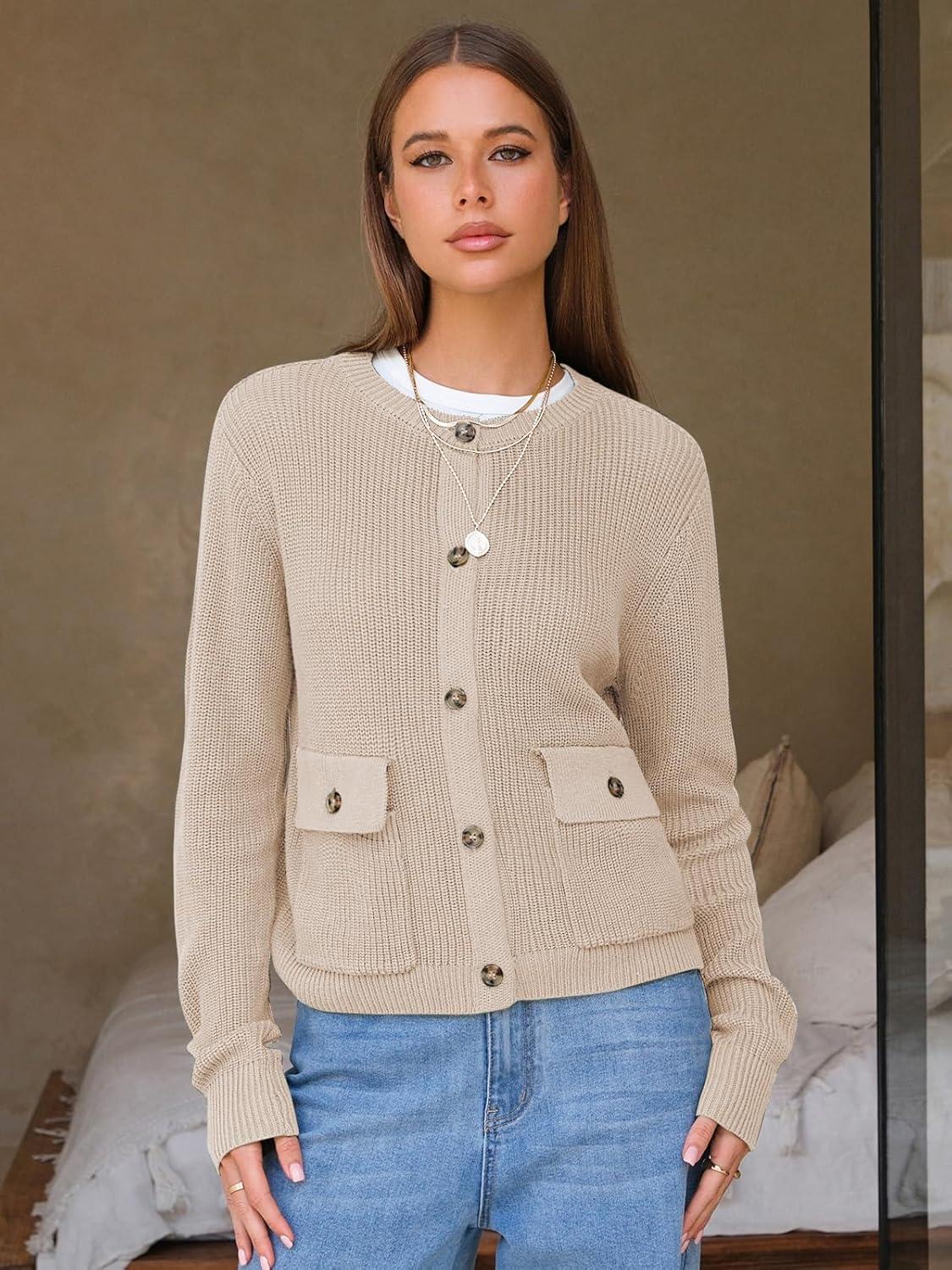 EXLURA Womens 2025 Knit Cardigan Sweaters Fall Winter Crewneck Open Front Button Jacket Fashion Outerwear Coats with Pockets(Beige)
