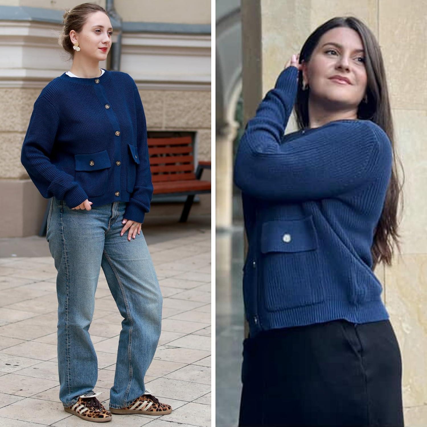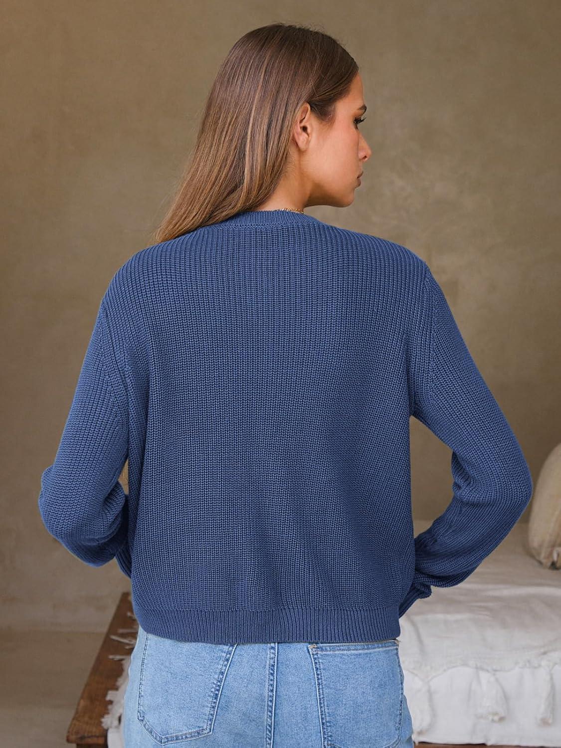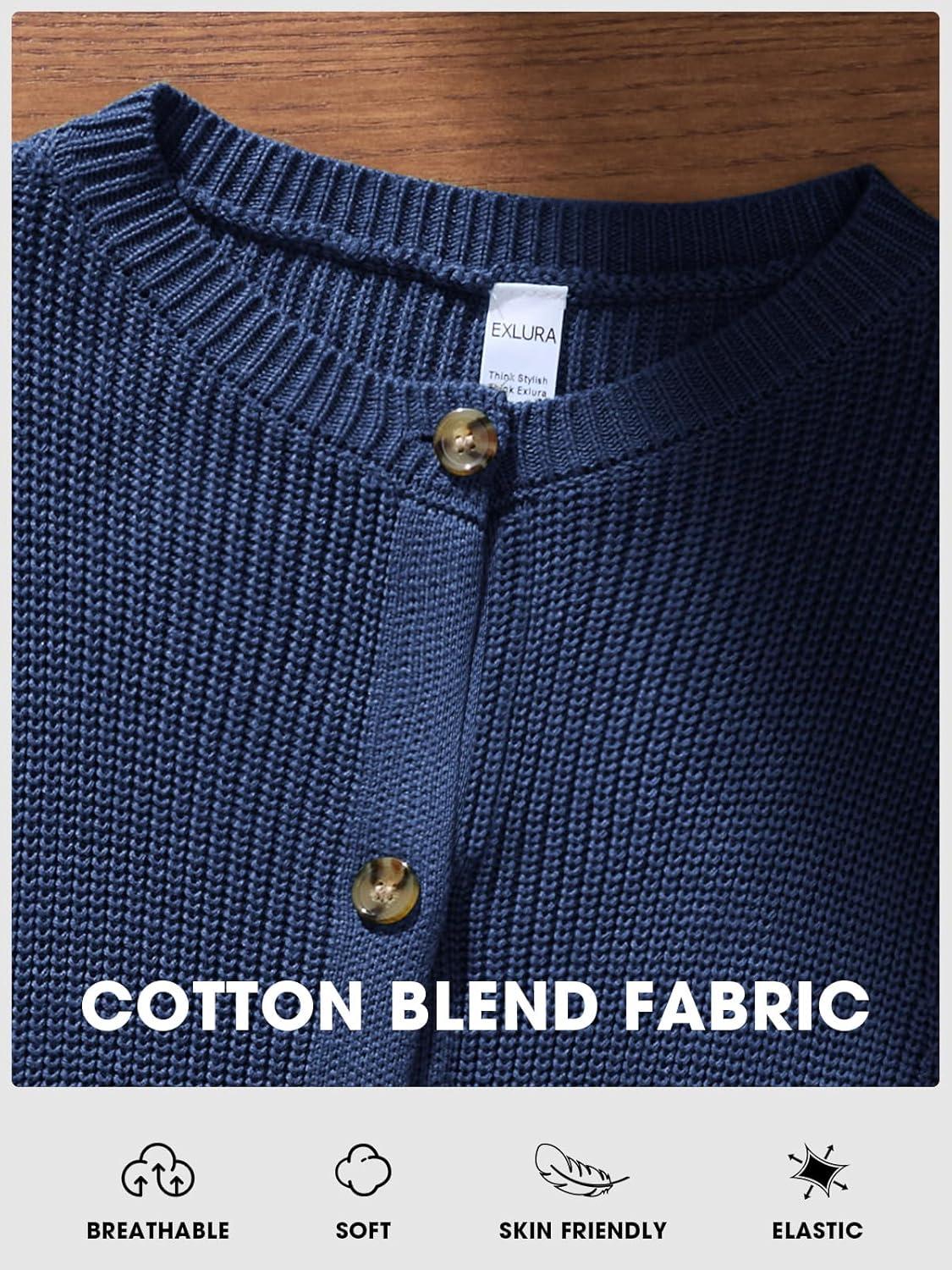 EXLURA Womens 2025 Knit Cardigan Sweaters Fall Winter Crewneck Open Front Button Jacket Fashion Outerwear Coats with Pockets(Navy)