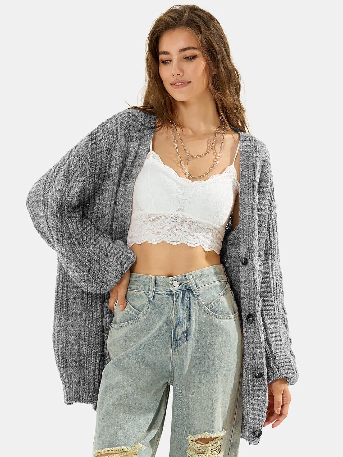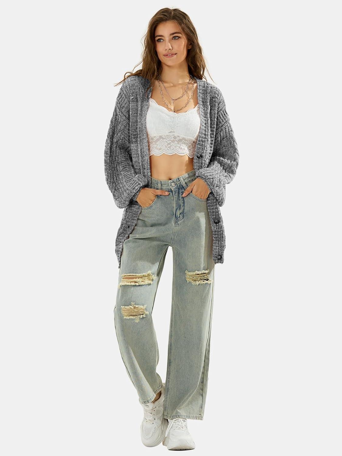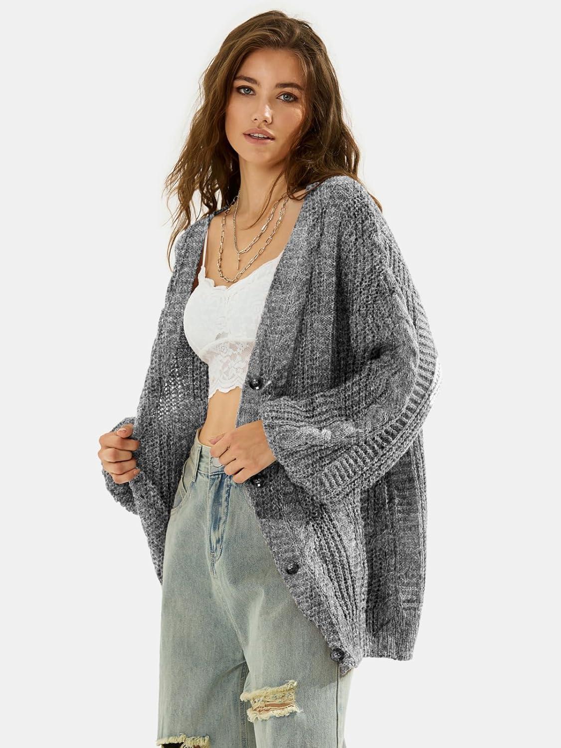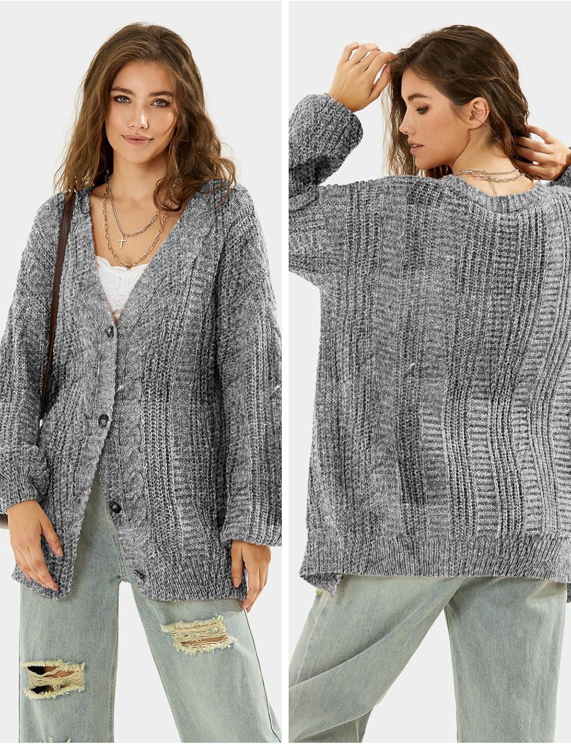 EXLURA Womens 2025 Oversized Cardigan Sweaters Fall Winter Lightweight Soft Knit Cardigan Open Front Button Outwear Coats(Grey White)