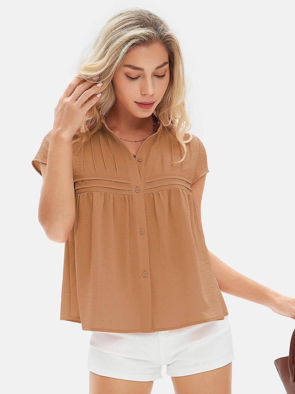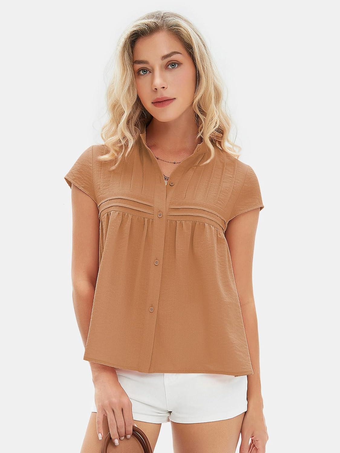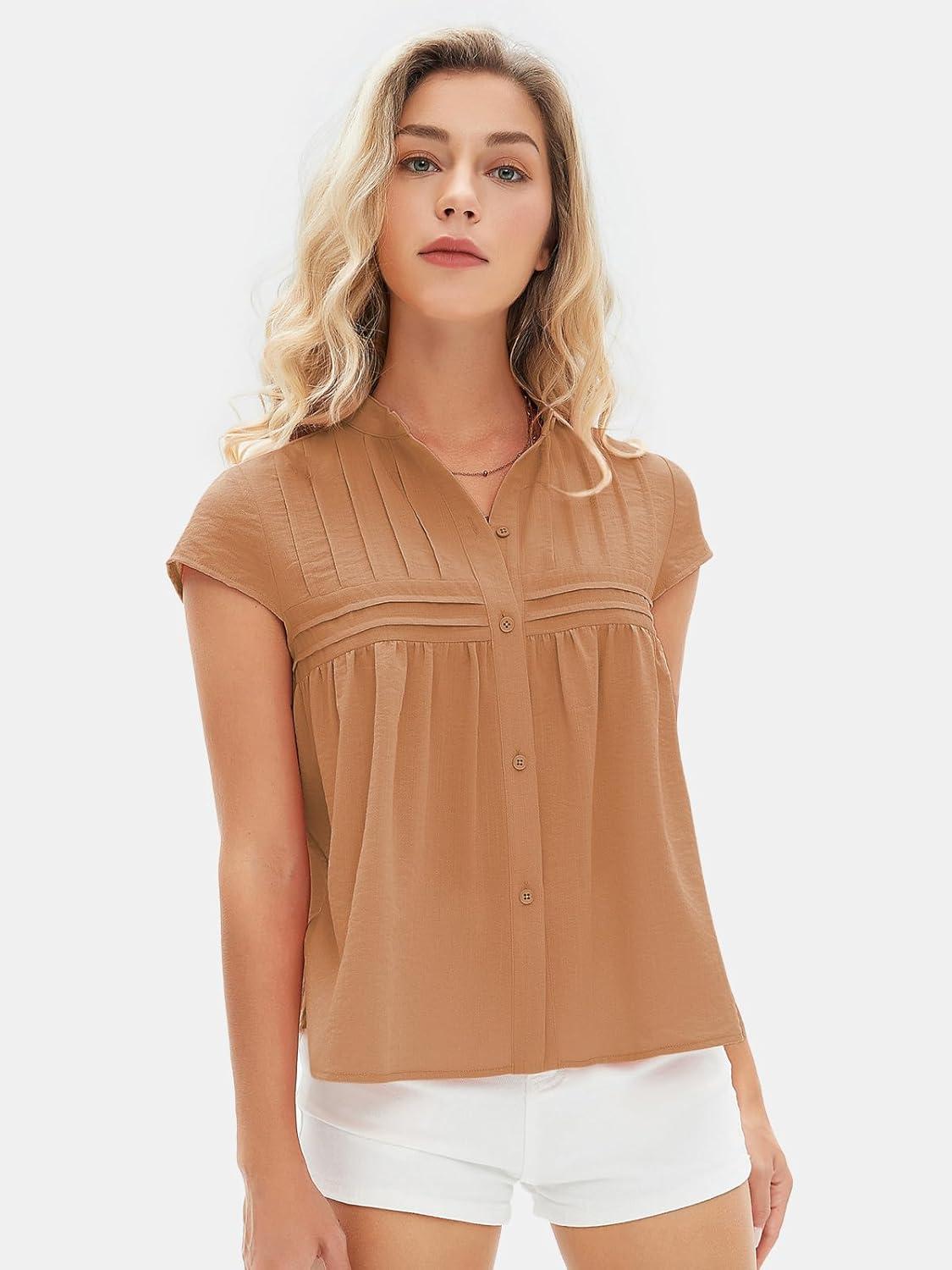 EXLURA Women’s 2025 Summer Cap Sleeve Tops Loose Button Down Dress Shirt Casual V Neck Pleated Textured Work Blouse