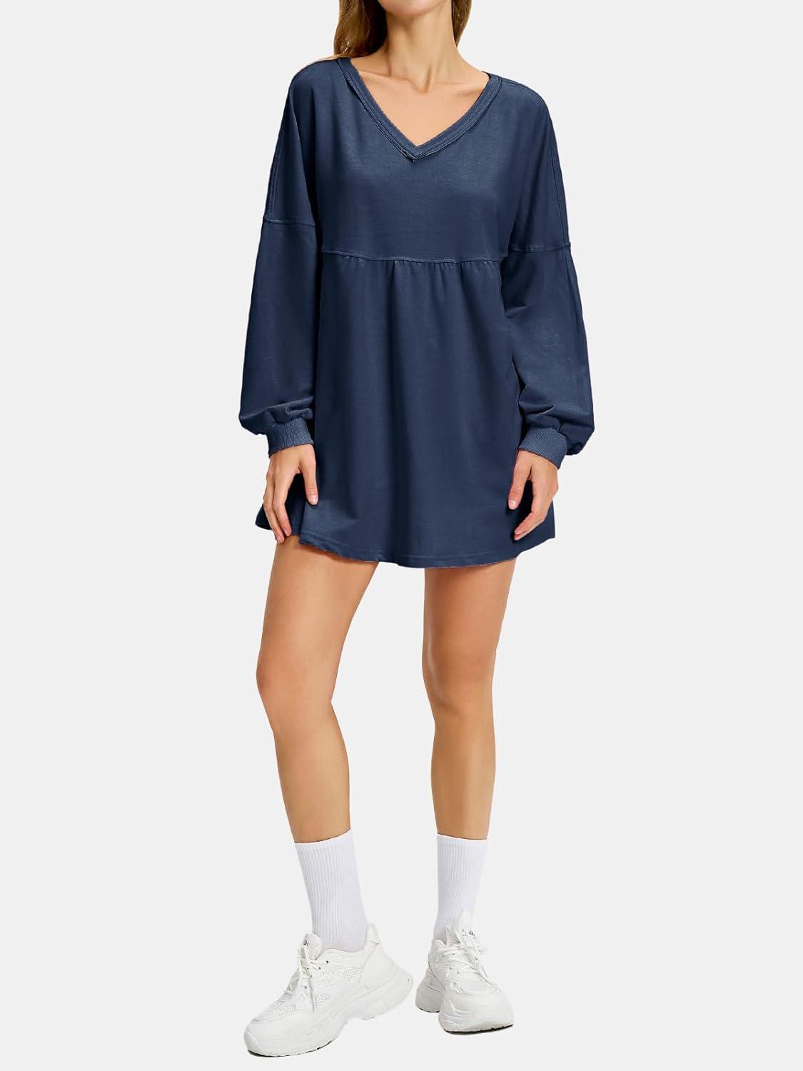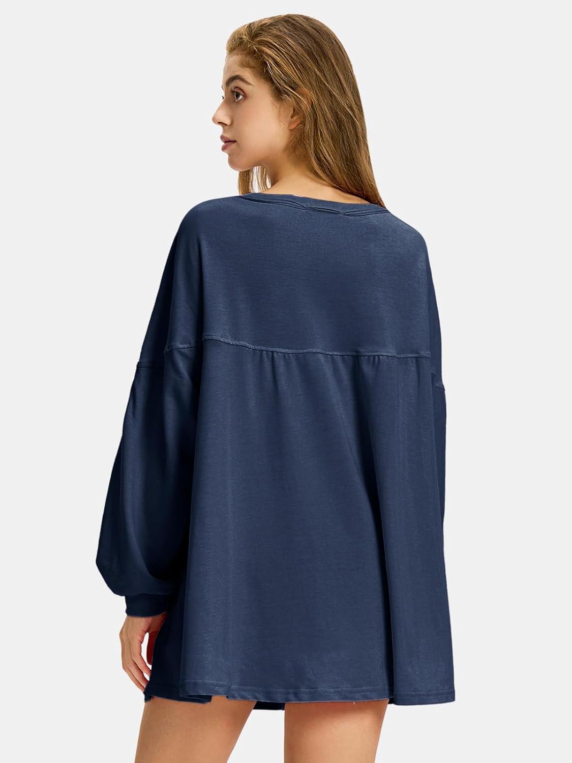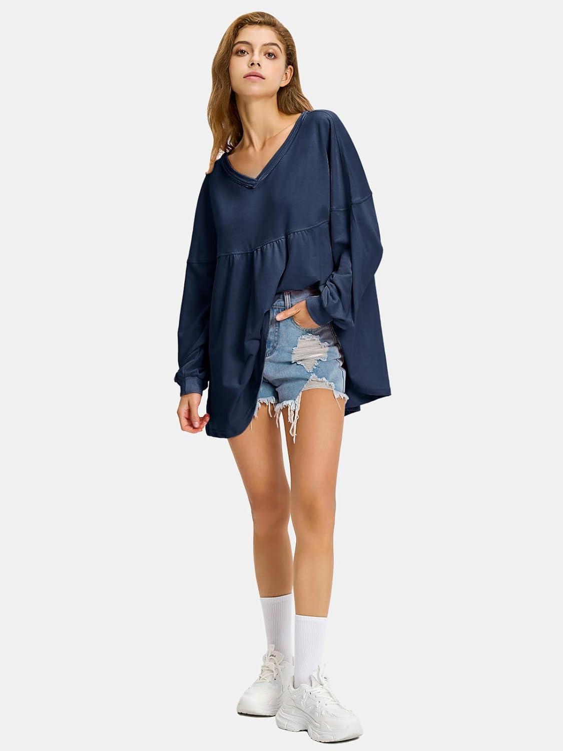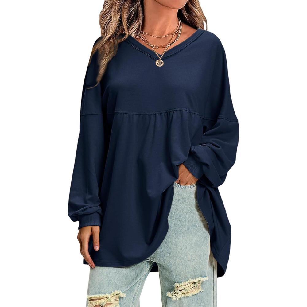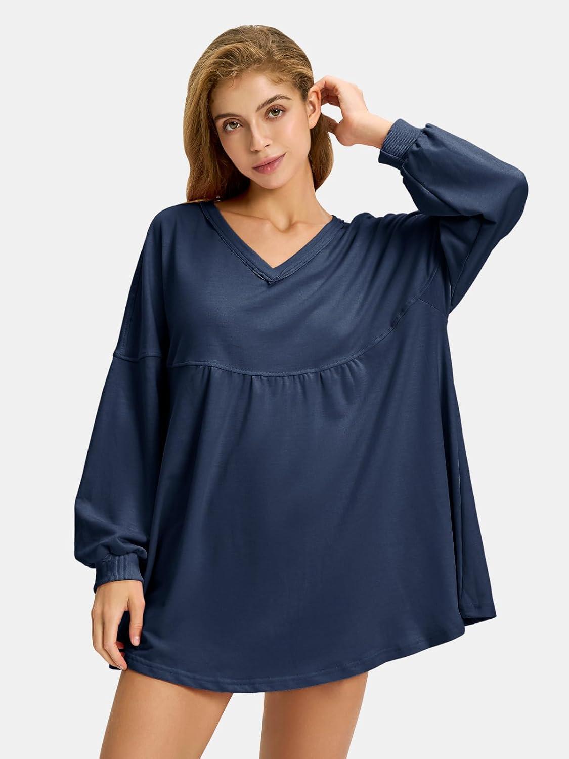 EXLURA Womens Fall Long Sleeve Shirts V Neck Casual Maternity Tops Loose Babydoll Pullover Dressy Tunic Blouse Outfits 2025(Dark Blue)