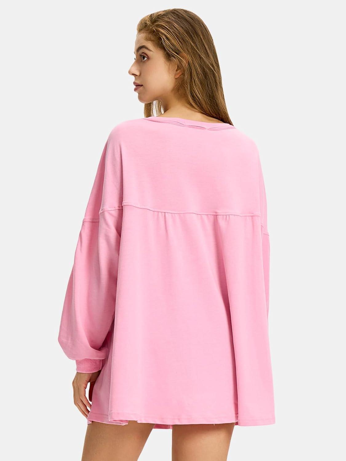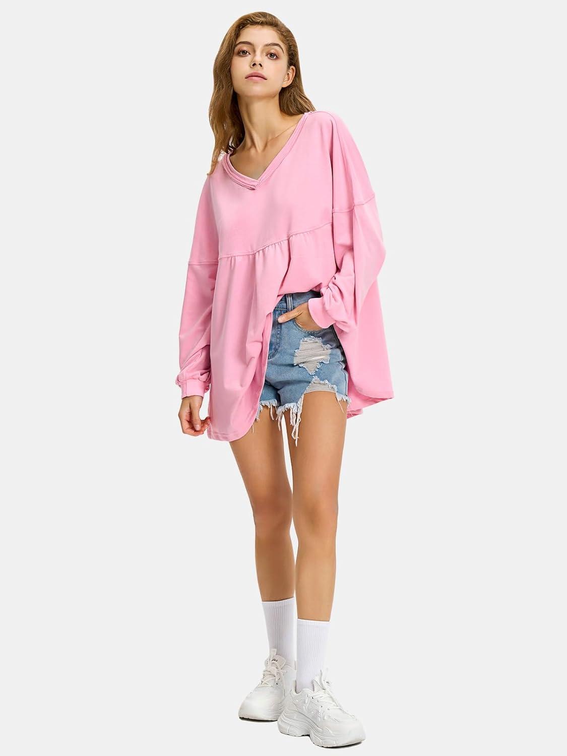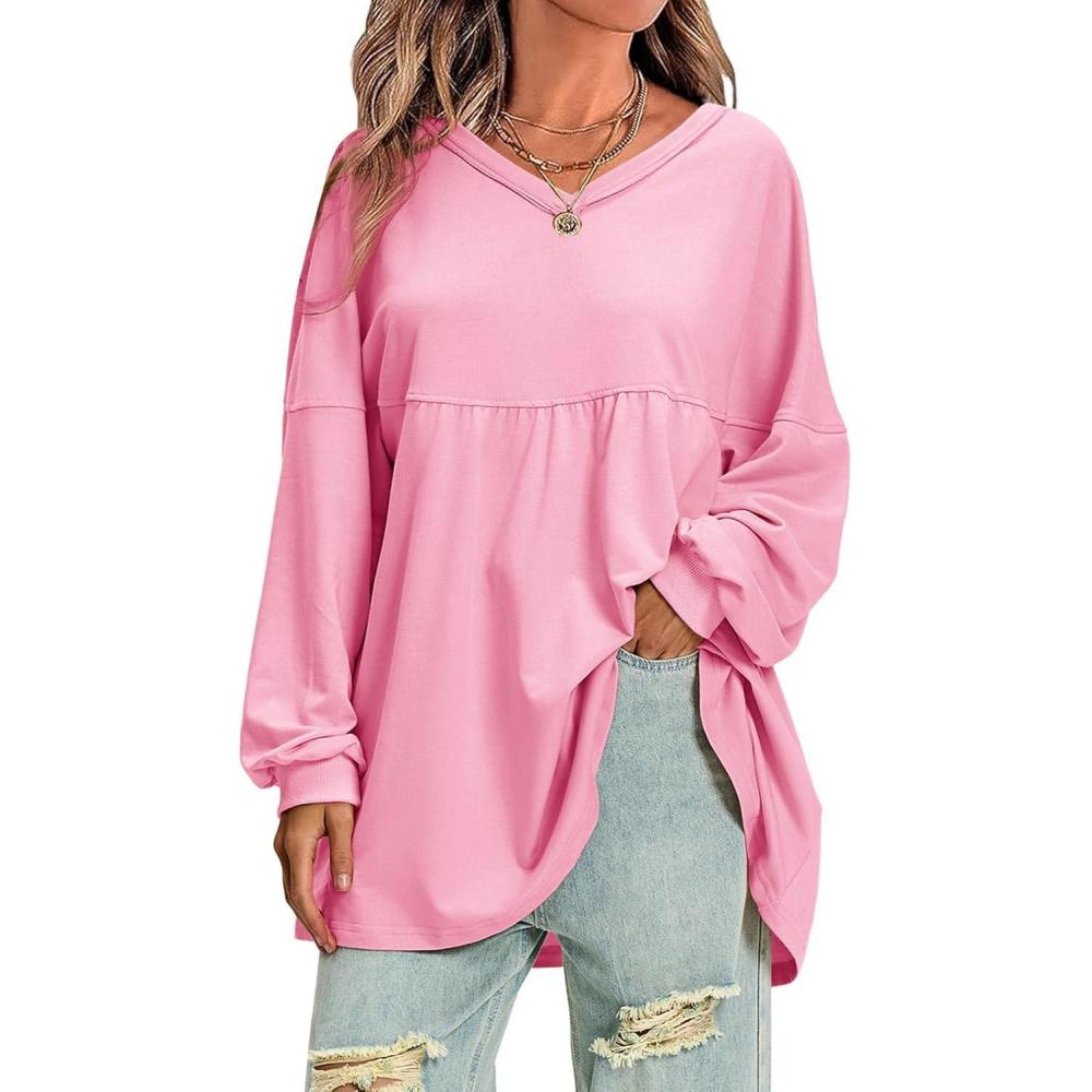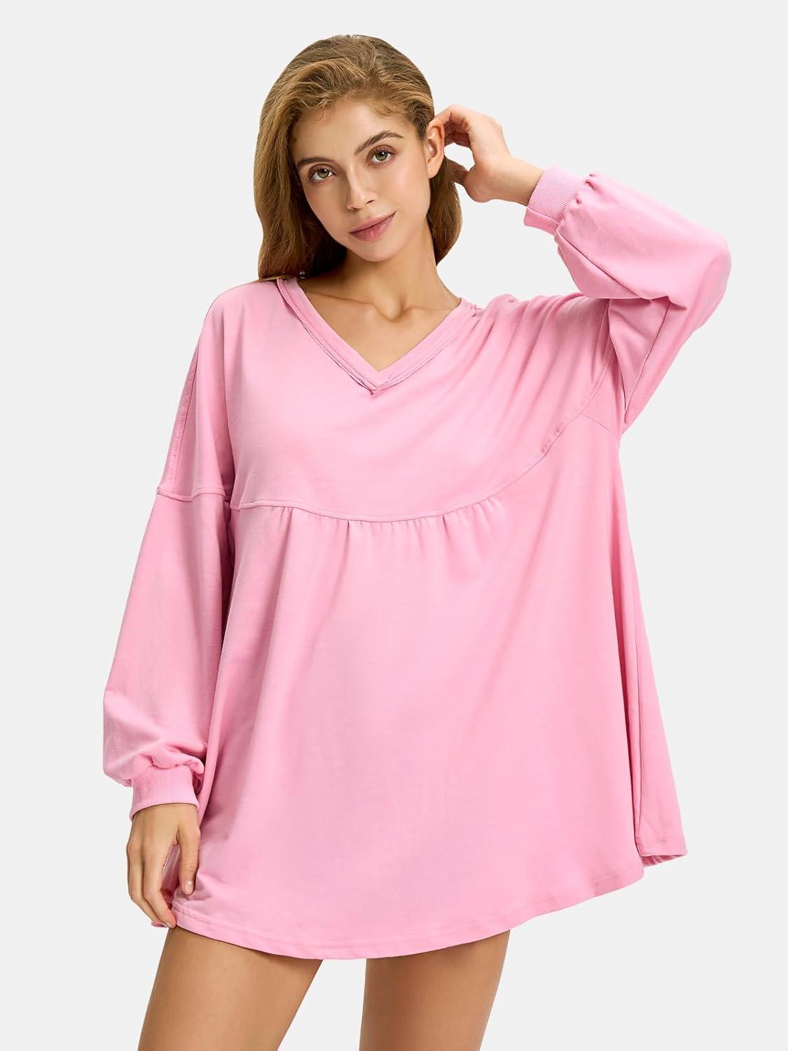 EXLURA Womens Fall Long Sleeve Shirts V Neck Casual Maternity Tops Loose Babydoll Pullover Dressy Tunic Blouse Outfits 2025(Pink)