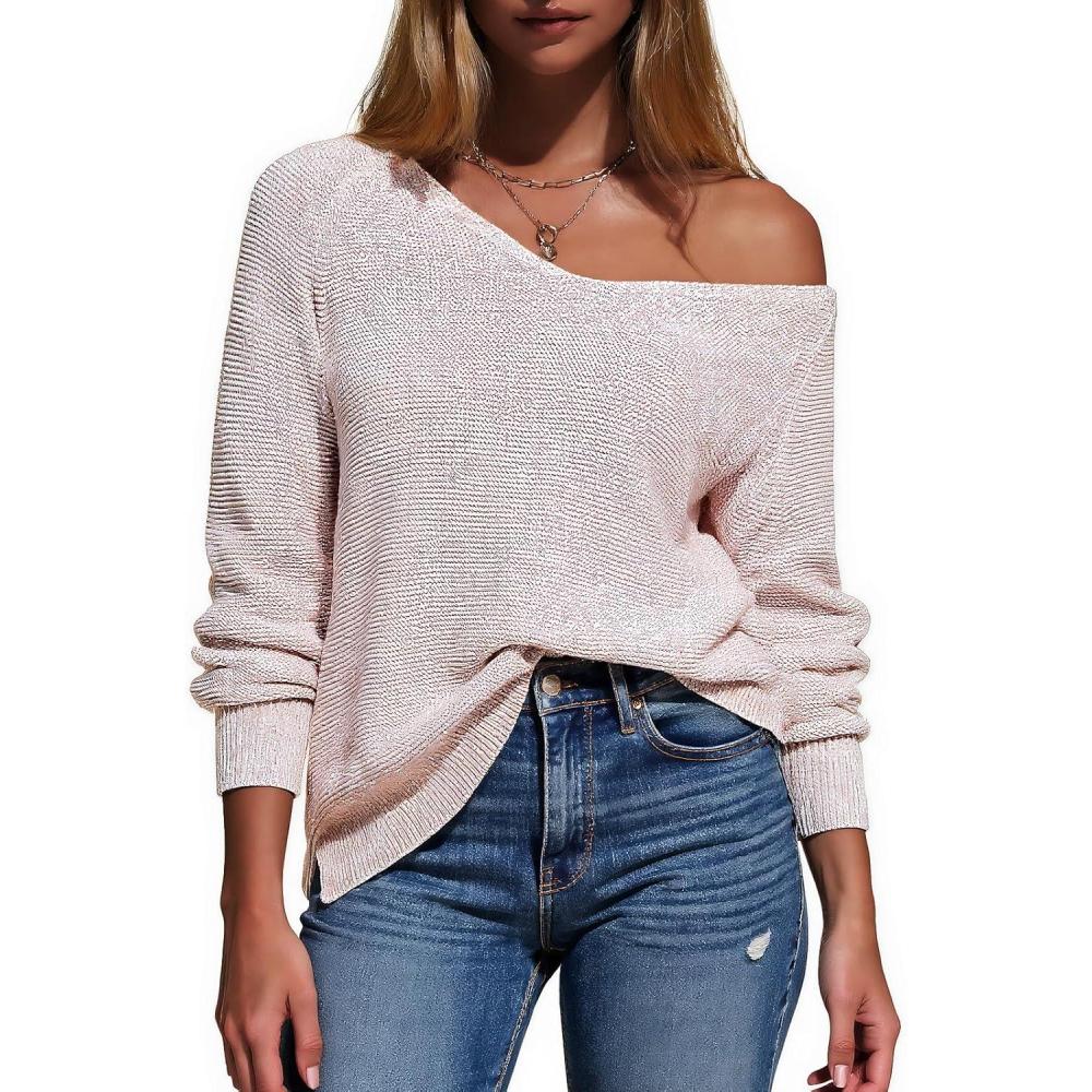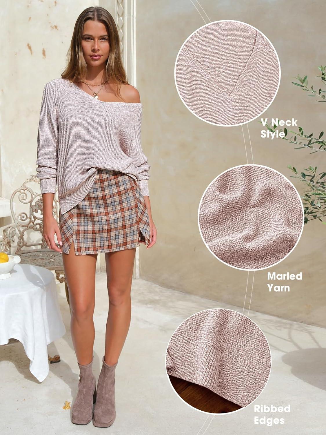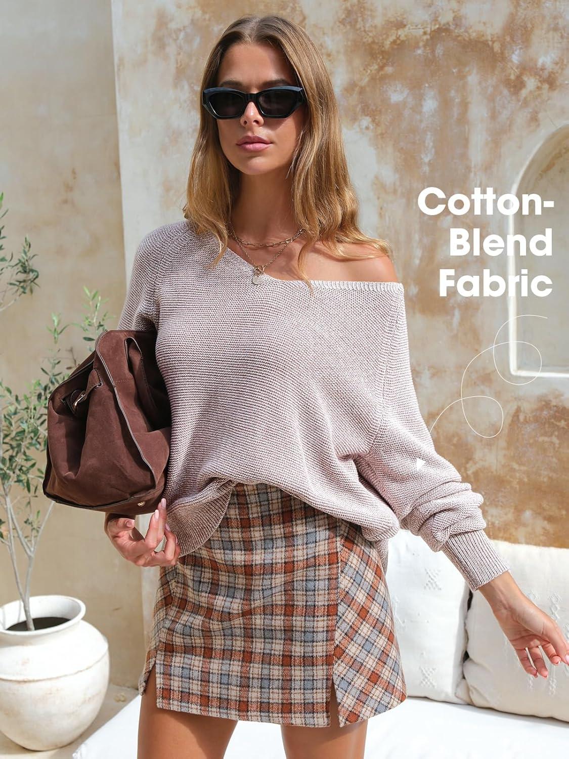 EXLURA Womens Fall Oversized Sweaters Cotton Long Sleeve V Neck Off Shoulder Sweater Pullover Jumper Tops Trendy Winter 2025(Light Khaki)