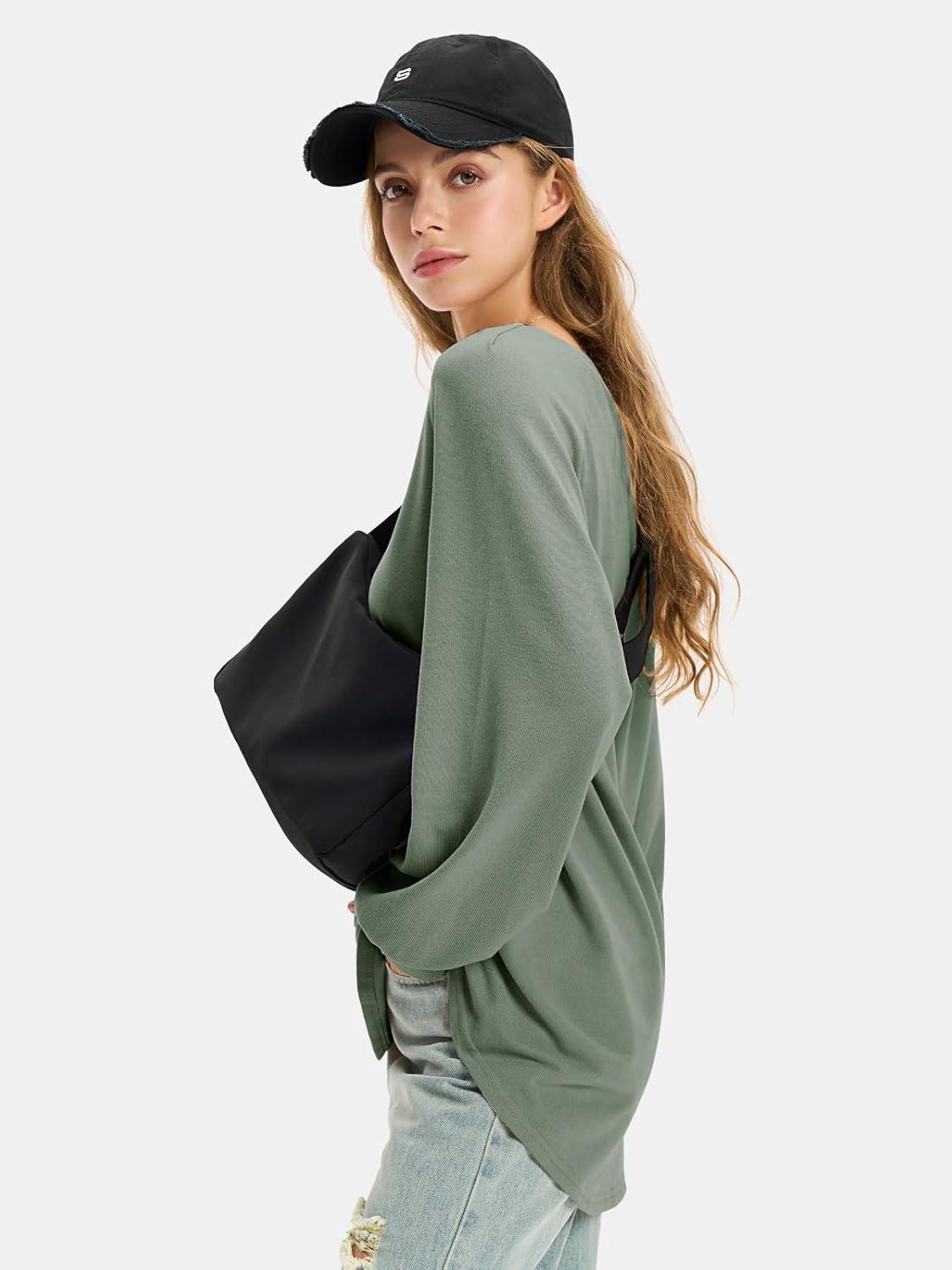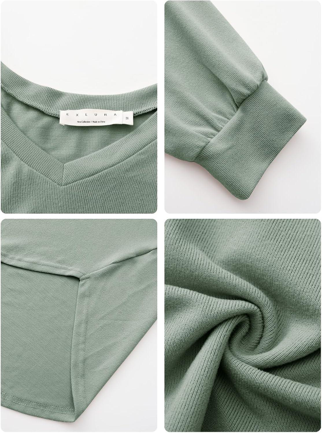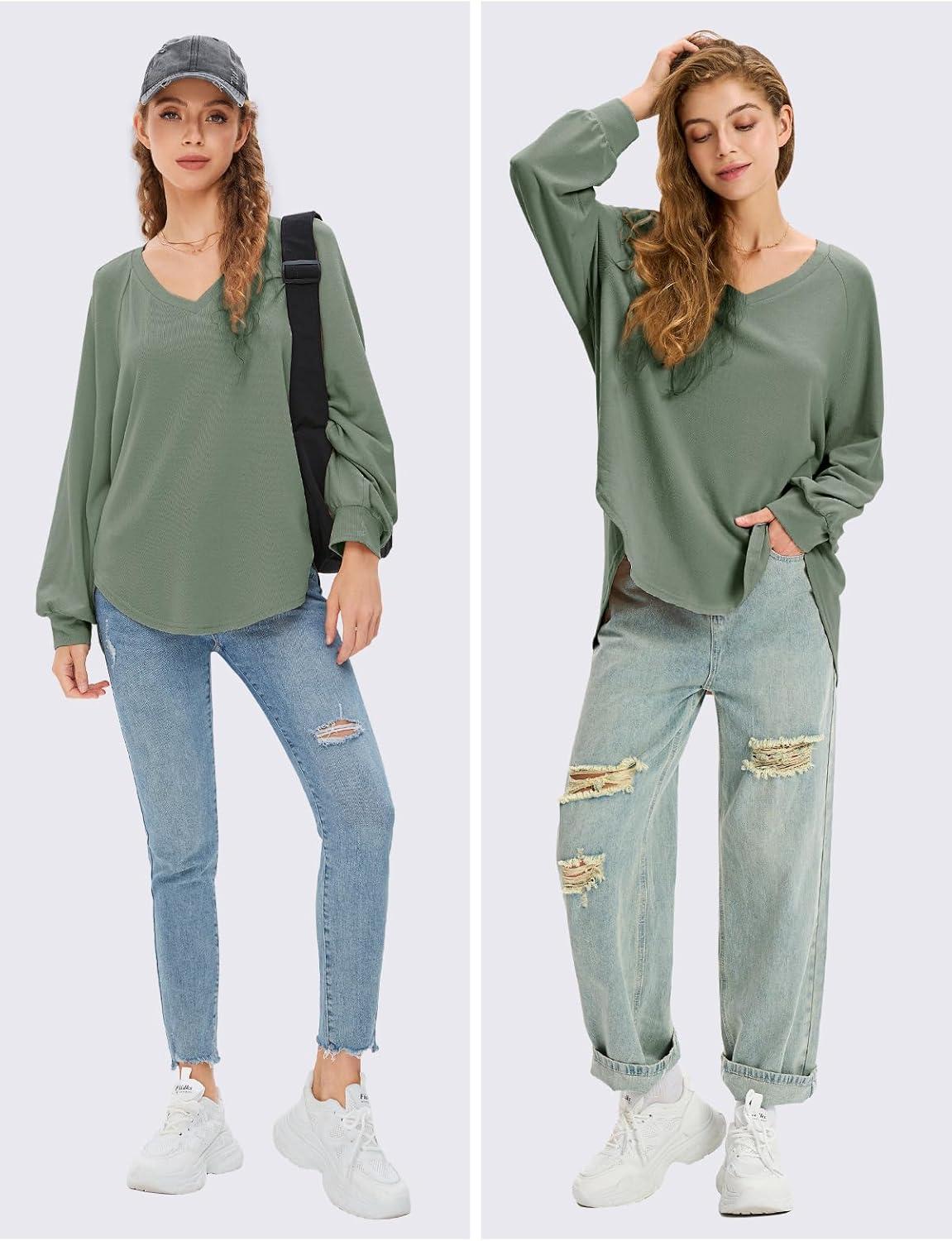 EXLURA Womens Fall Oversized V Neck Tunic Tops 2025 Casual Long Sleeve Shirts Lightweight Soft Sweater Curved Hem T Shirts(Army Green)
