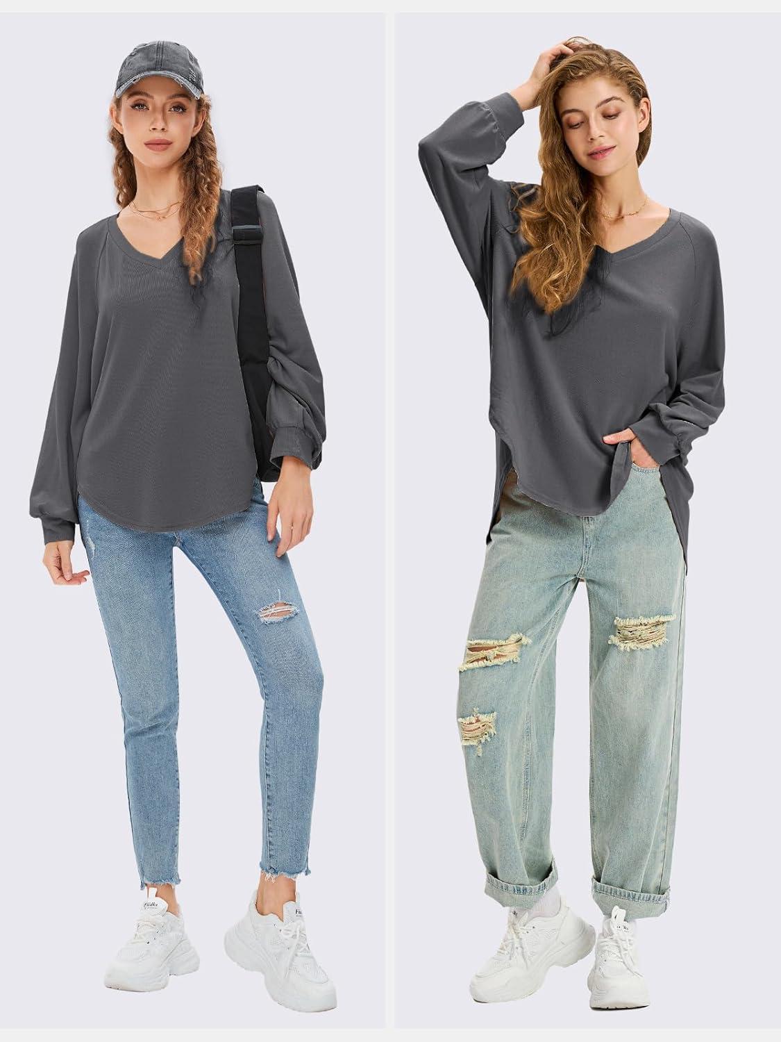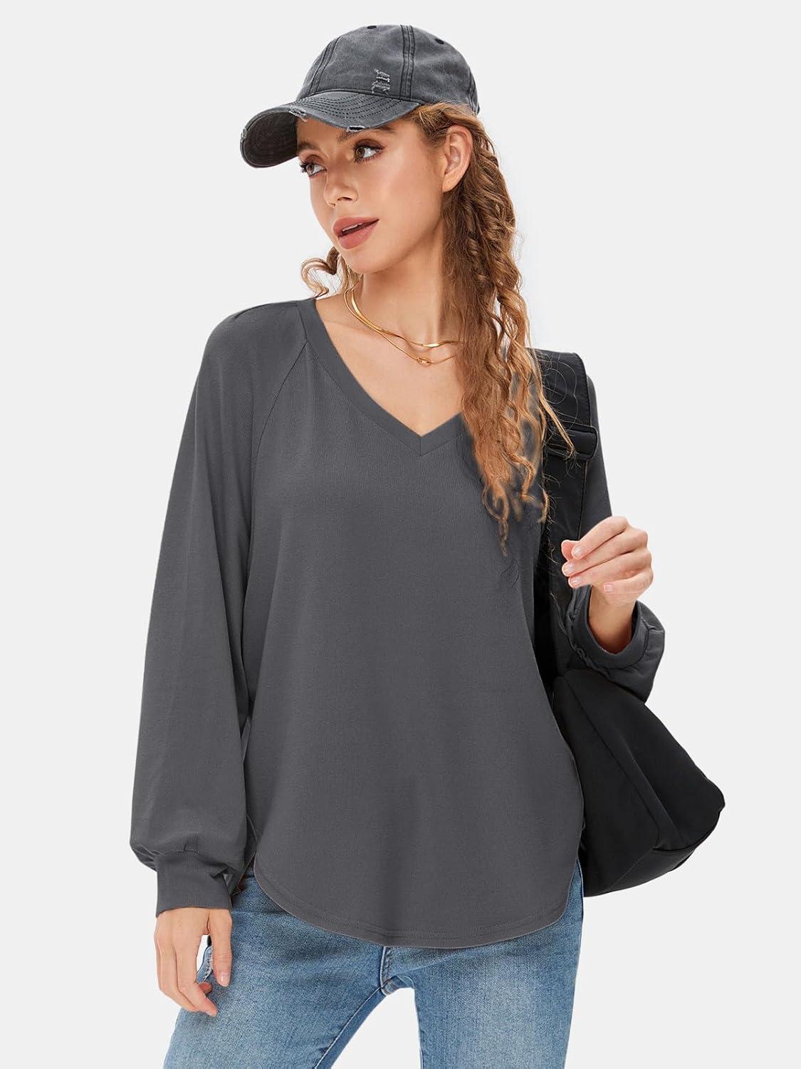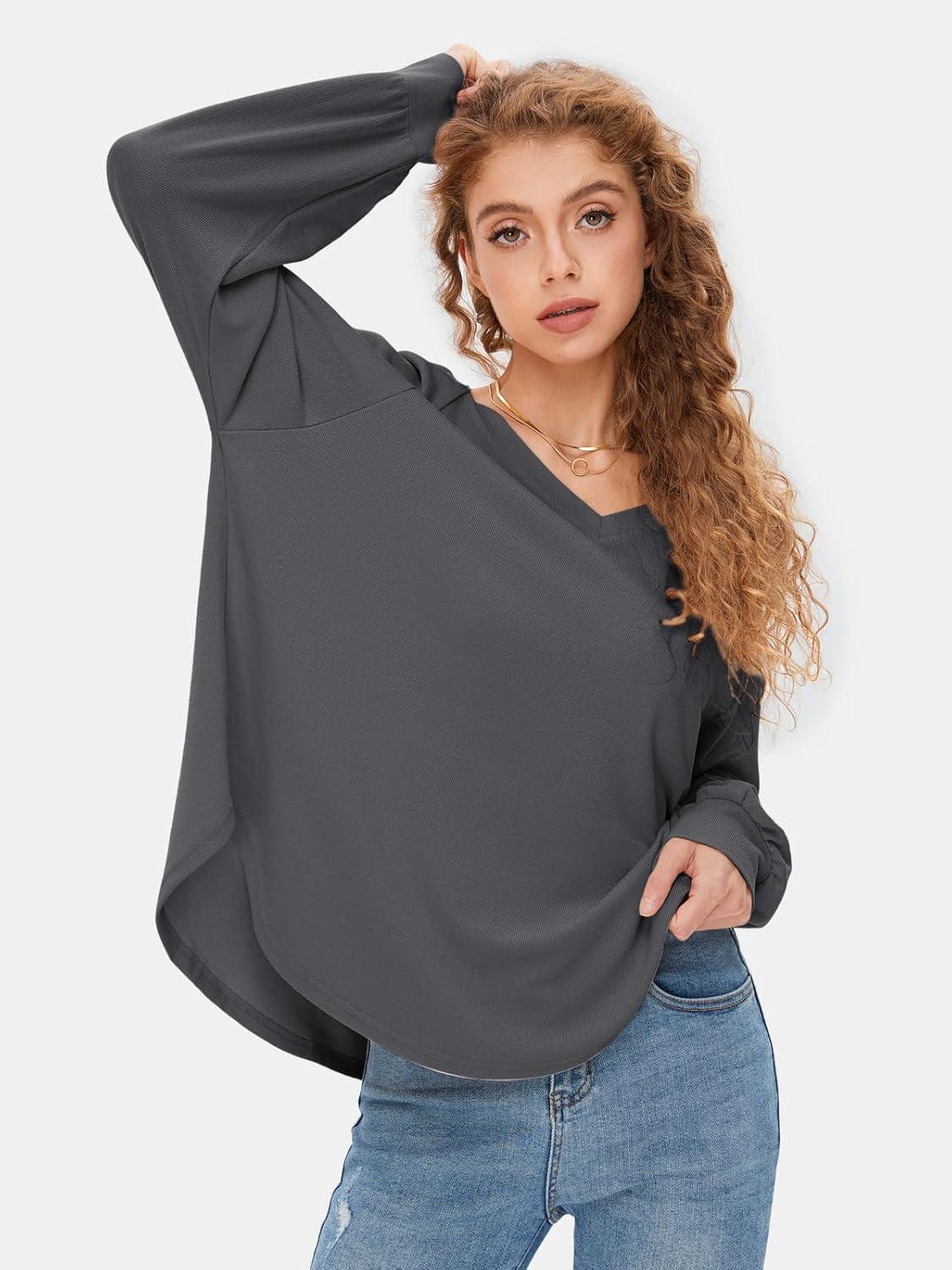 EXLURA Womens Fall Oversized V Neck Tunic Tops 2025 Casual Long Sleeve Shirts Lightweight Soft Sweater Curved Hem T Shirts(Dark Grey)