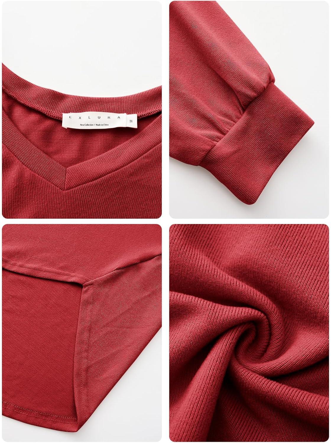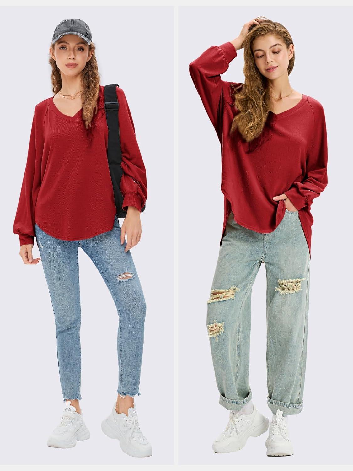 EXLURA Womens Fall Oversized V Neck Tunic Tops 2025 Casual Long Sleeve Shirts Lightweight Soft Sweater Curved Hem T Shirts(Red)