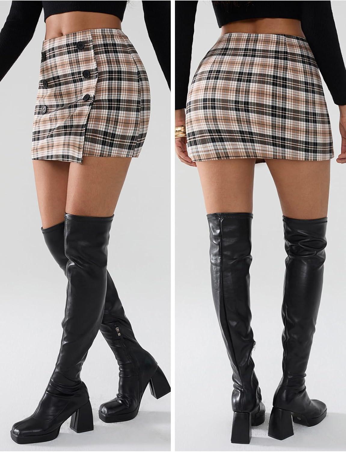 EXLURA Womens Fall Plaid Bodycon Mini Skirts High Elastic Wasit Short Skirt Trendy Winter Sexy Y2K Fashion Outfit(Coffee Plaid)
