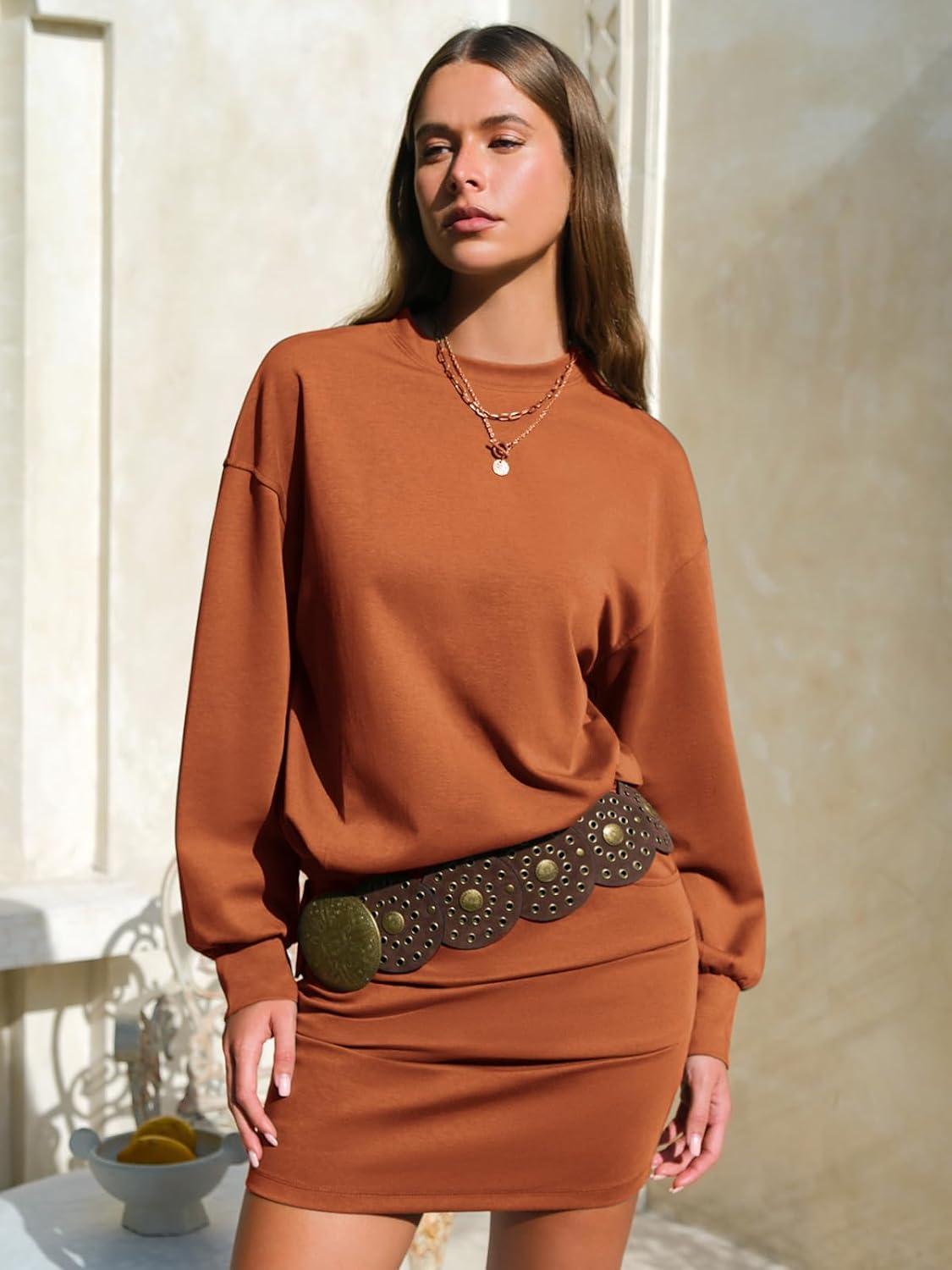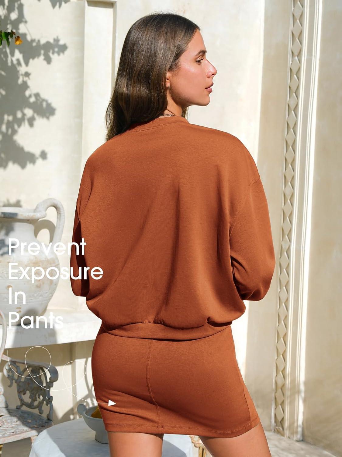 EXLURA Womens Fall Two Piece Skirt Sets Cotton Long Sleeve Mock Neck Sweatshirt Skort Matching Set Casual Tennis Outfits 2025(Caramel)