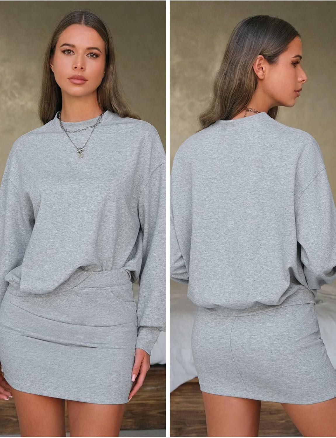 EXLURA Womens Fall Two Piece Skirt Sets Long Sleeve Mock Neck Sweatshirt Skort Matching Set Casual Lounge Tennis Outfits 2025(Grey)