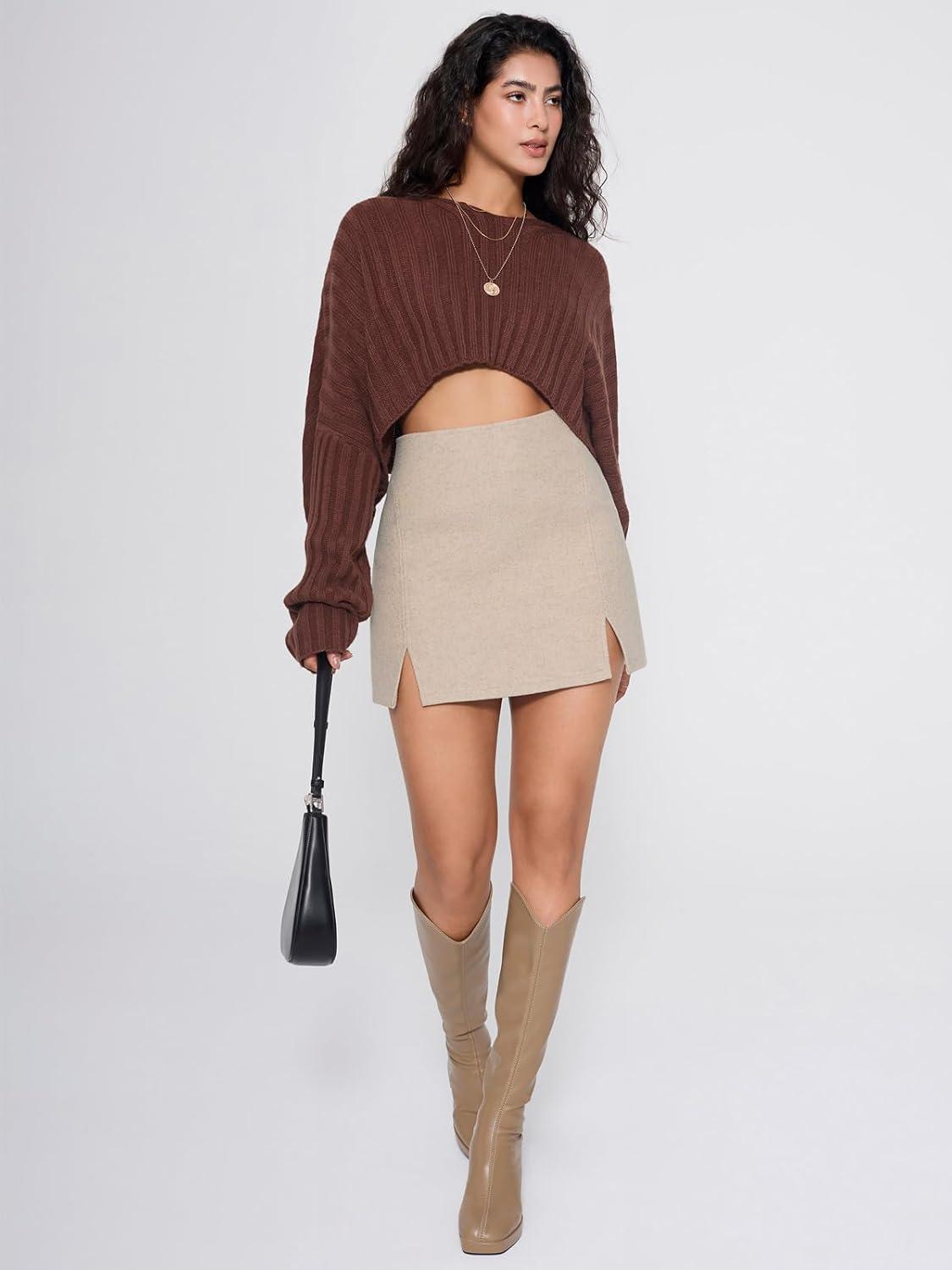 EXLURA Women’s Fashion Faux Wool Mini Skirt High Waisted Y2K Trendy Side Slit Tweed Plaid Skirts 2025 Fall Winter Outfits(Khaki)