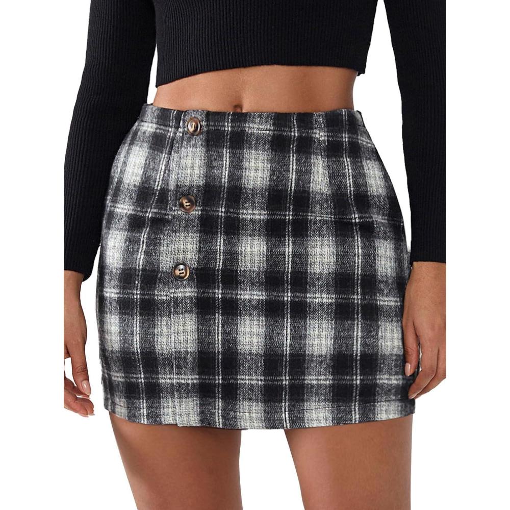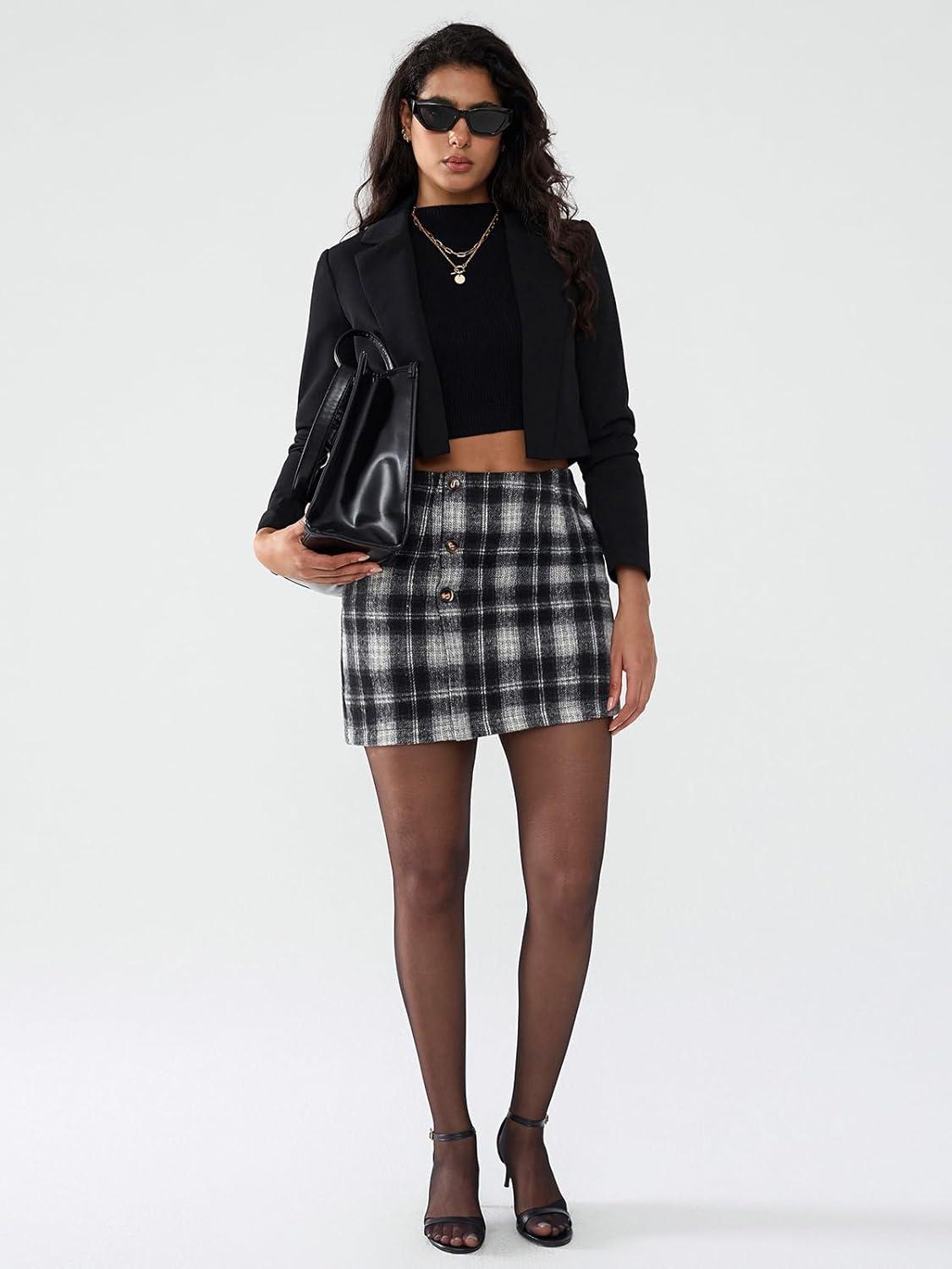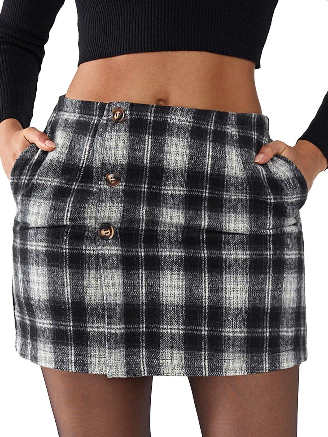 EXLURA Womens Faux Wool Plaid Mini Skirt Elastic High Waisted Tweed Skirts Button Bodycon Skirt Fall Winter Outfit Pocket(Black Plaid)