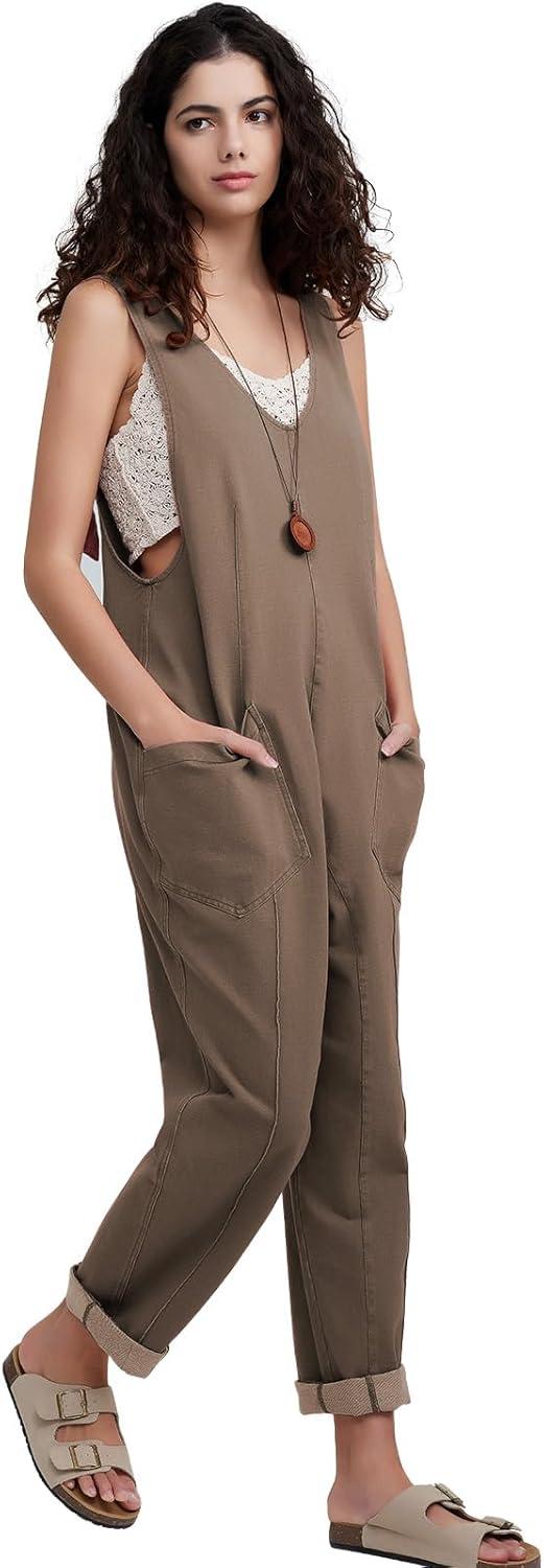 EXLURA Womens High Roller Denim Bib Jumpsuits Casual Loose Sleeveless Baggy Overalls Jeans Pants Jumpers with Pockets(Khaki)