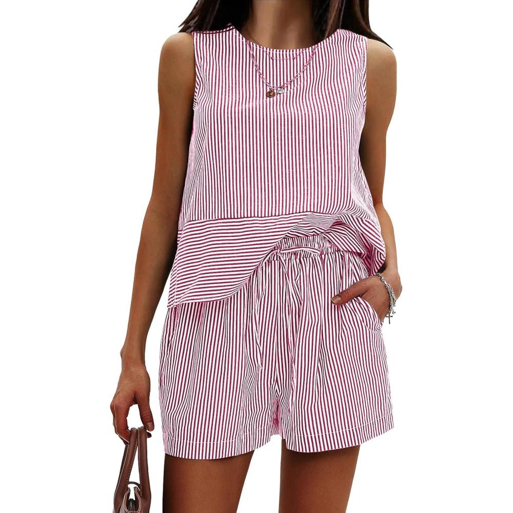 EXLURA Women’s Summer 2 Piece Outfits Sleeveless Tank Top Matching Shorts Sets Cotton Striped Airport Beach Vacation 2026(Red)