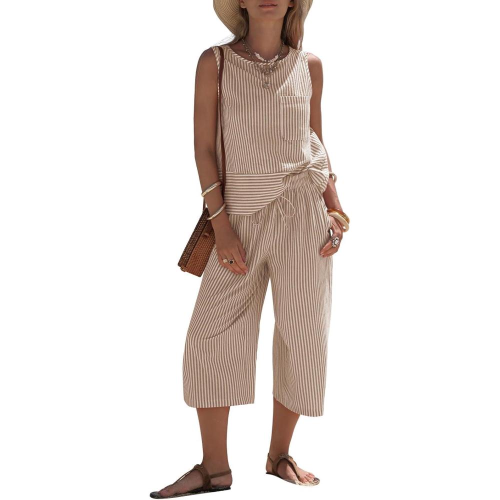 EXLURA Womens Summer Cotton 2 Piece Outfits Striped Sleeveless Top and Capri Wide Leg Pants Sets Pockets Beach Vacation 2026(Khaki)