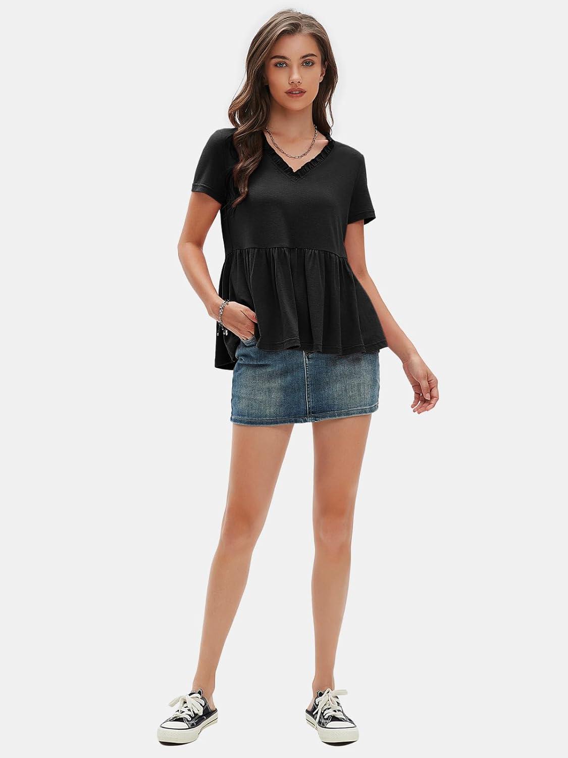 EXLURA Women’s Summer Crop Babydoll Peplum Tops Cute V Neck Short Sleeve Business Casual Trendy T Shirts Beach Vacation 2025(Black)