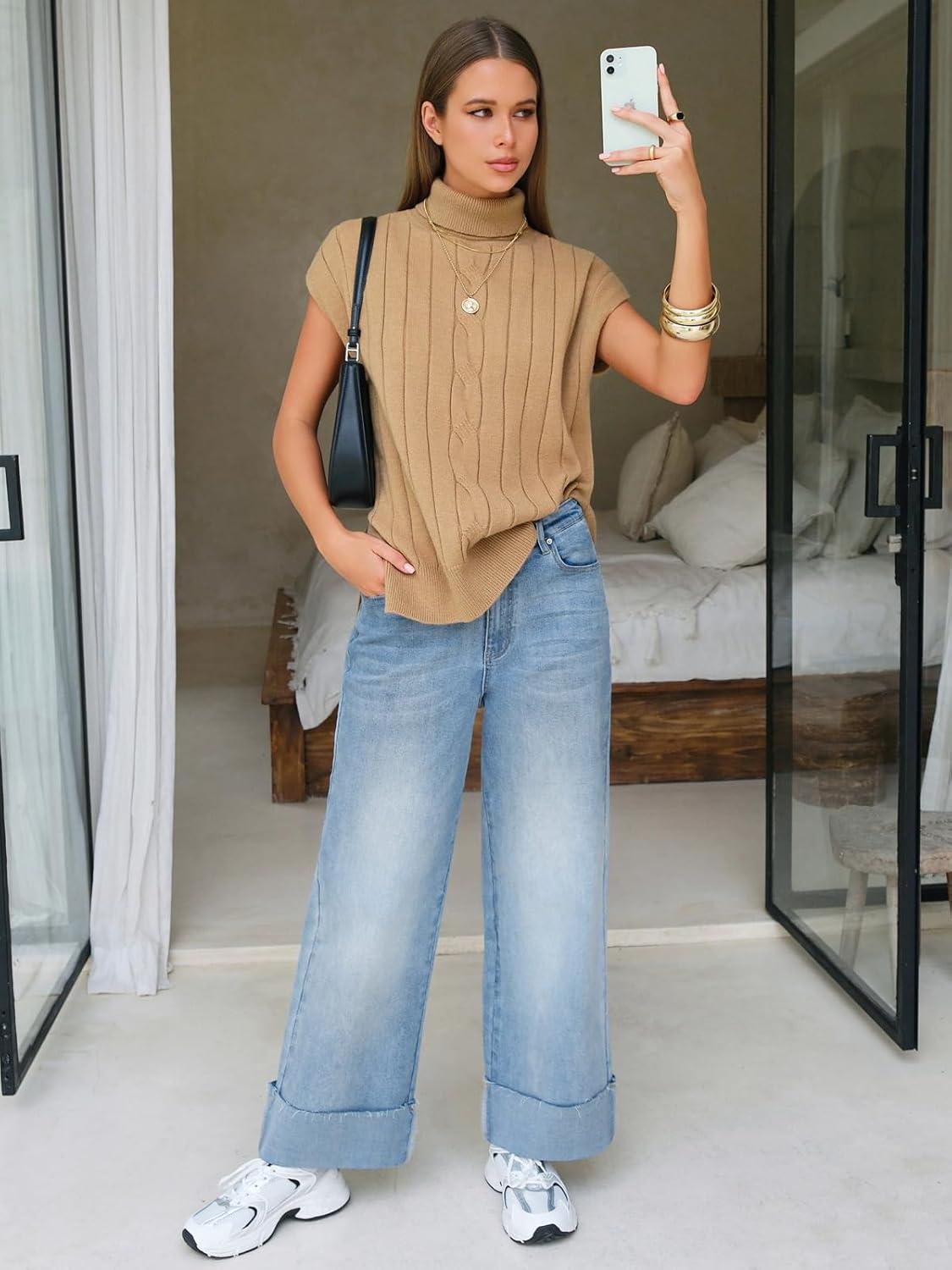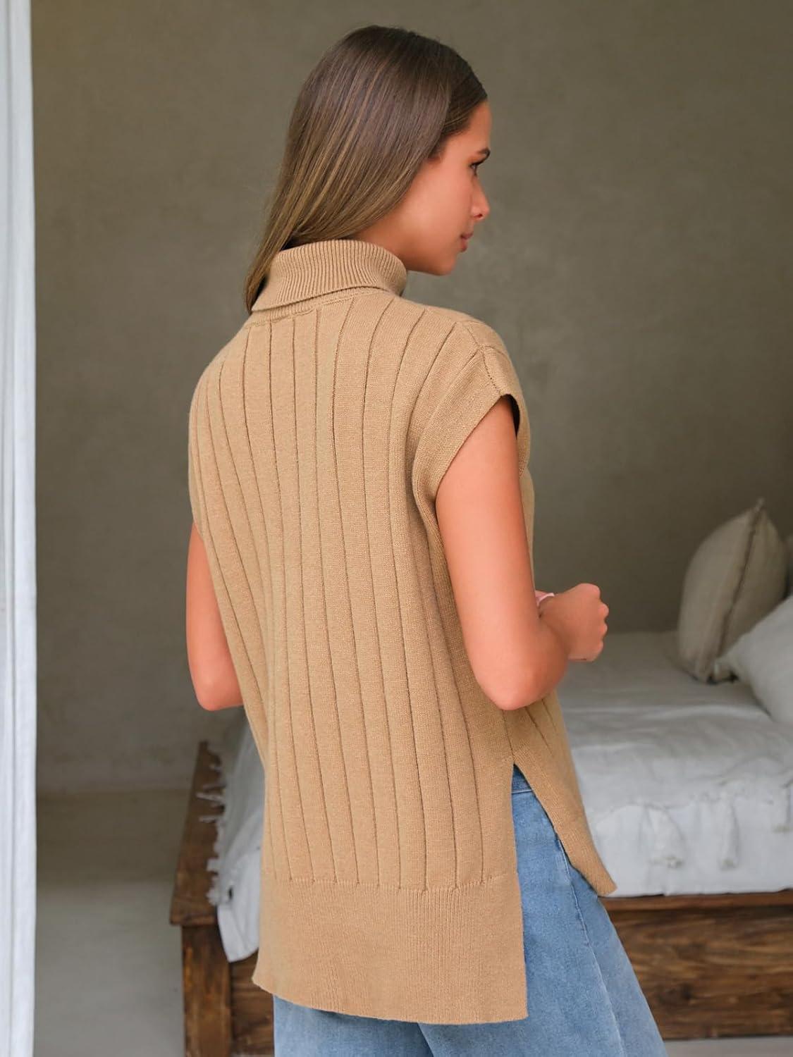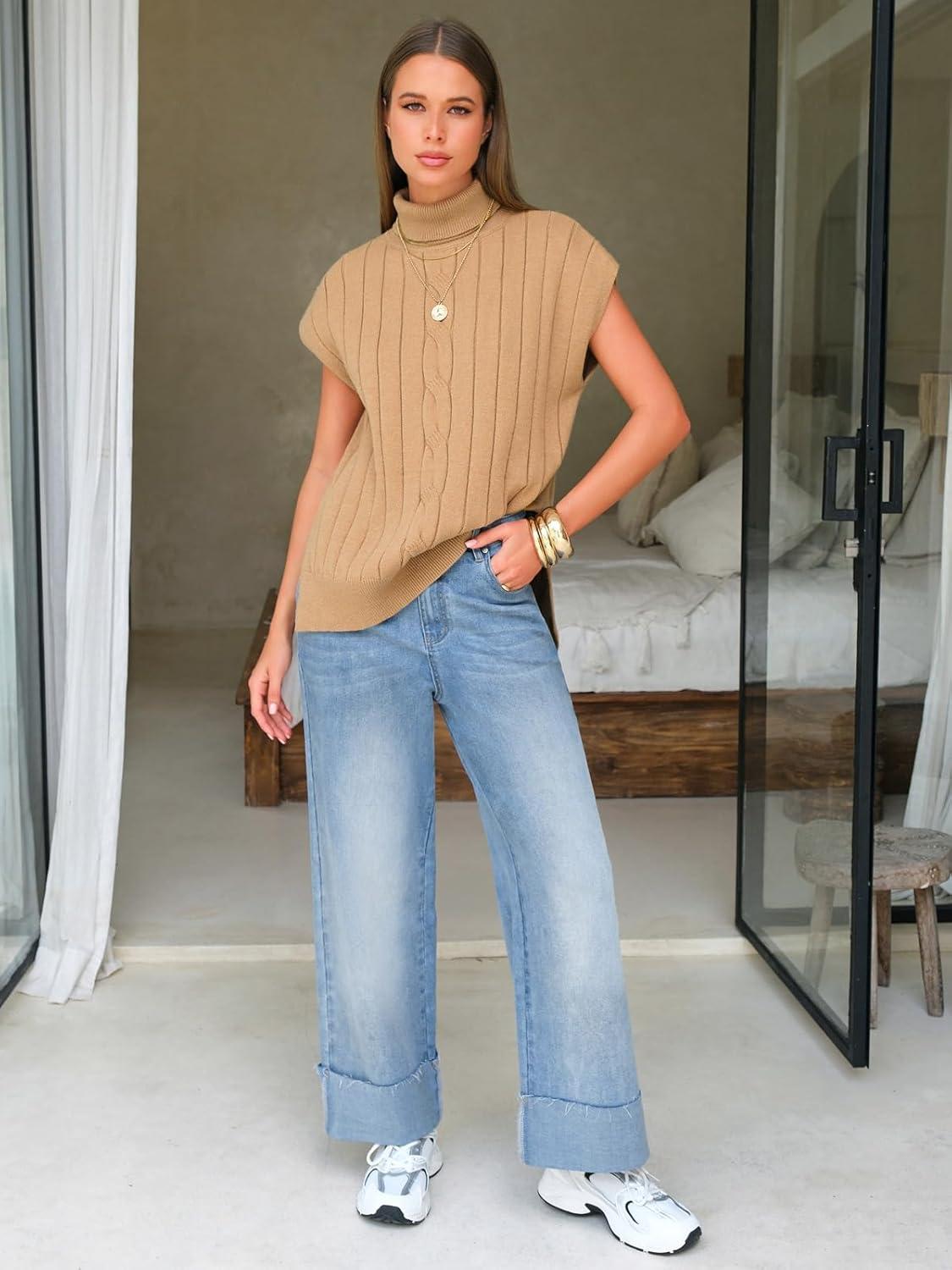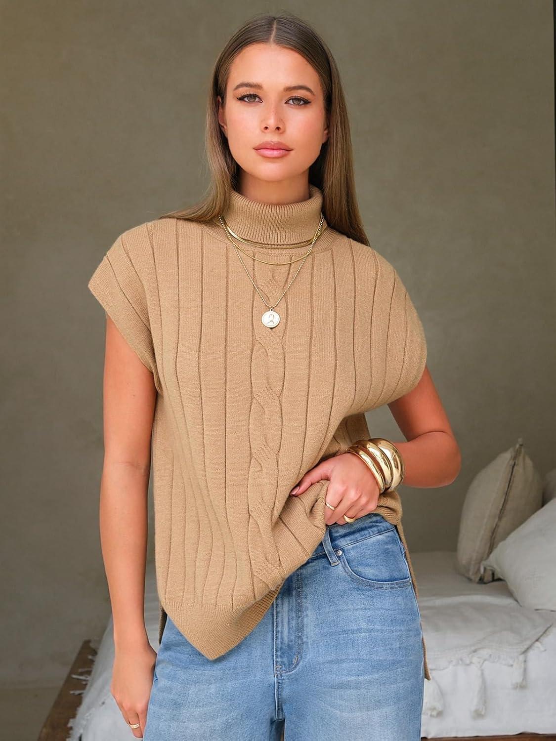 EXLURA Women’s Turtleneck Sleeveless Sweater Vest Casual Short Cap Sleeve Knit Pullover Tank Tops 2025 Fashion Fall Clothes(Light Brown)