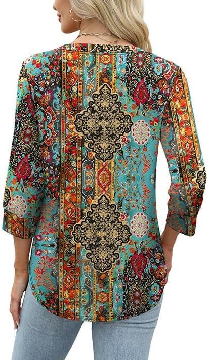 This top has a stylish split neckline with two gold buttons, adding elegance. Its three-quarter sleeves balance coverage and breathability for all seasons. Made of soft fabric, it ensures comfort. The loose fit enables easy movement and a casual look. Versatile, it pairs well with jeans or skirts, perfect for daily wear and special events.